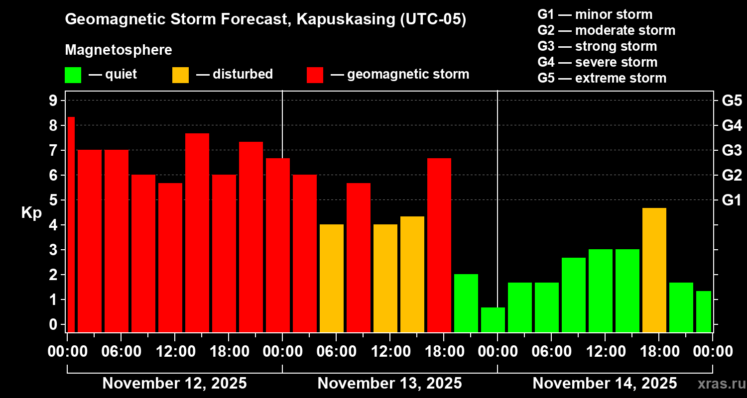 Geomagnetic storm forecast in Kapuskasing for Nov 12, 2025