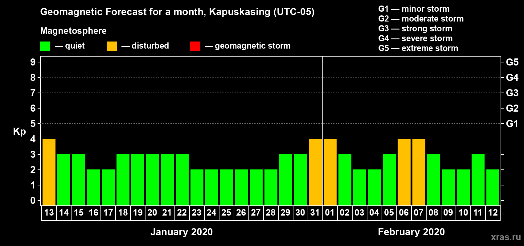 Geomagnetic storm forecast in Kapuskasing for Jan 13, 2020