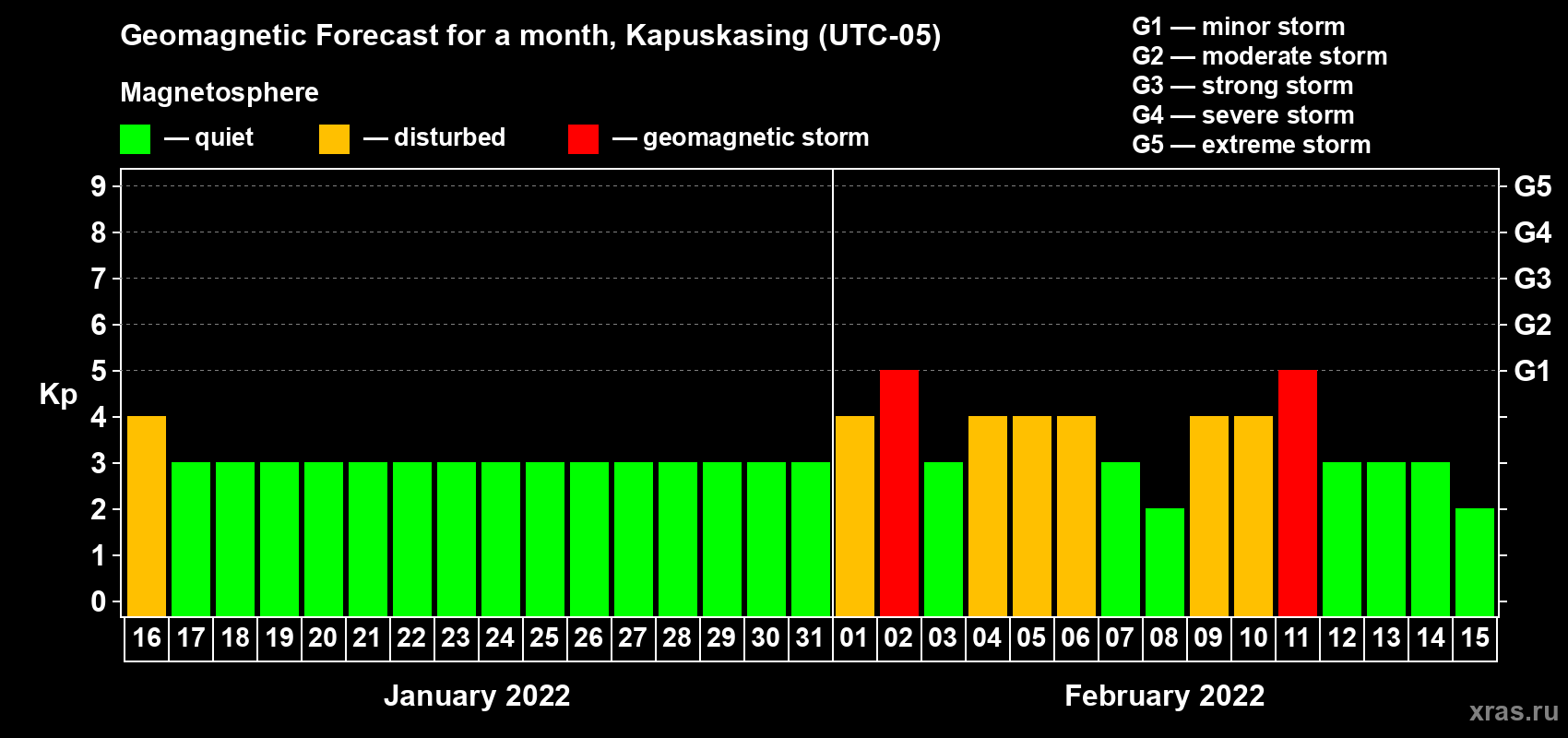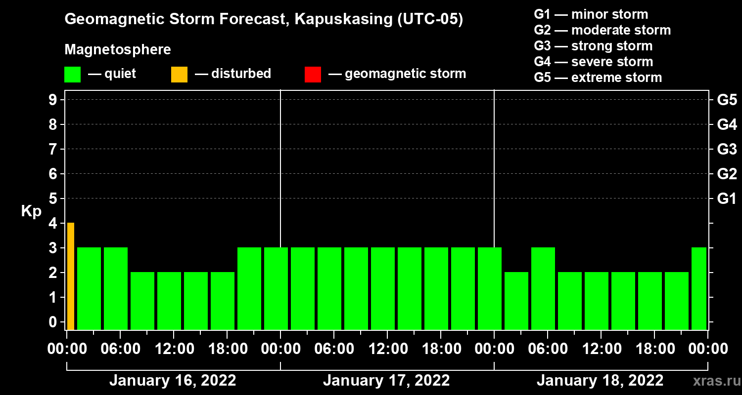 Geomagnetic storm forecast in Kapuskasing for Jan 16, 2022