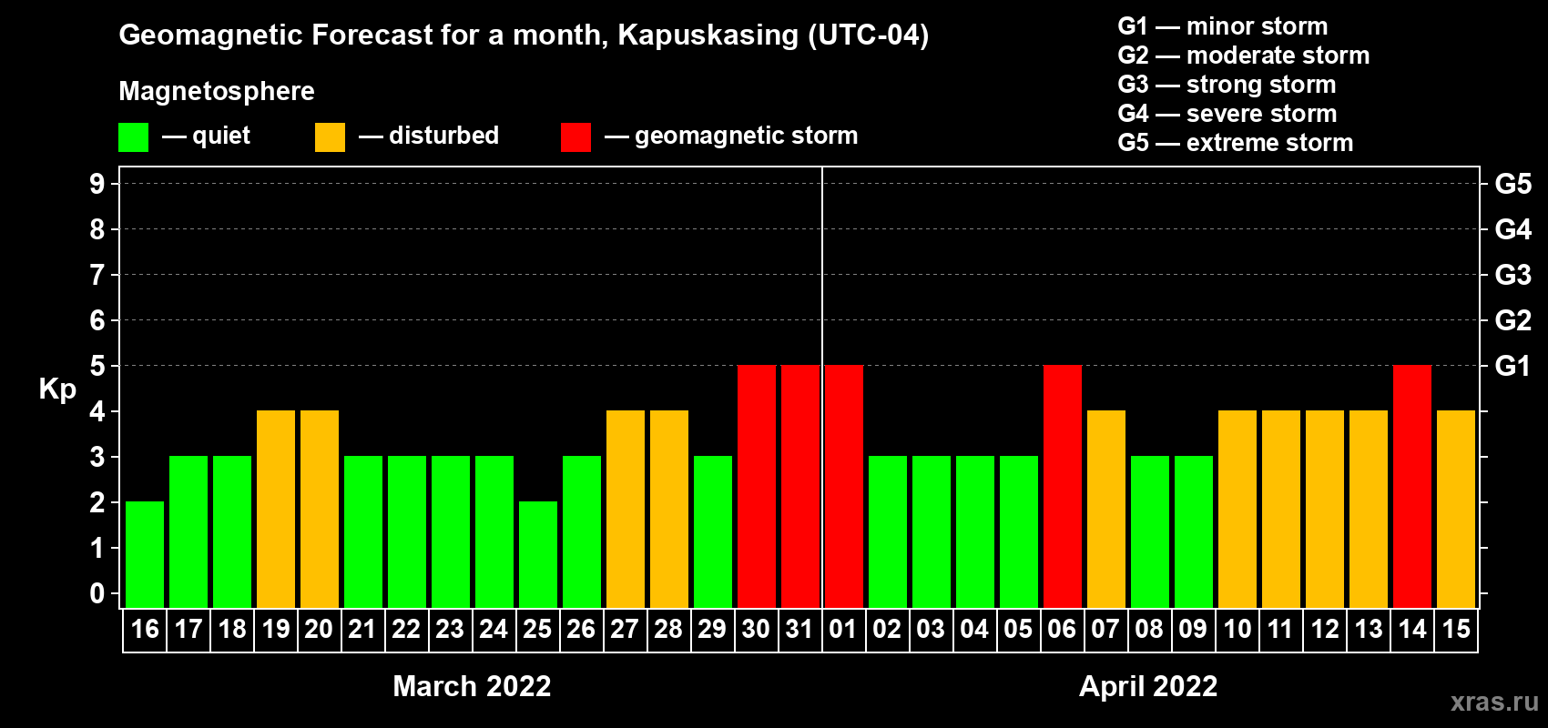 Geomagnetic storm forecast in Kapuskasing for Mar 16, 2022