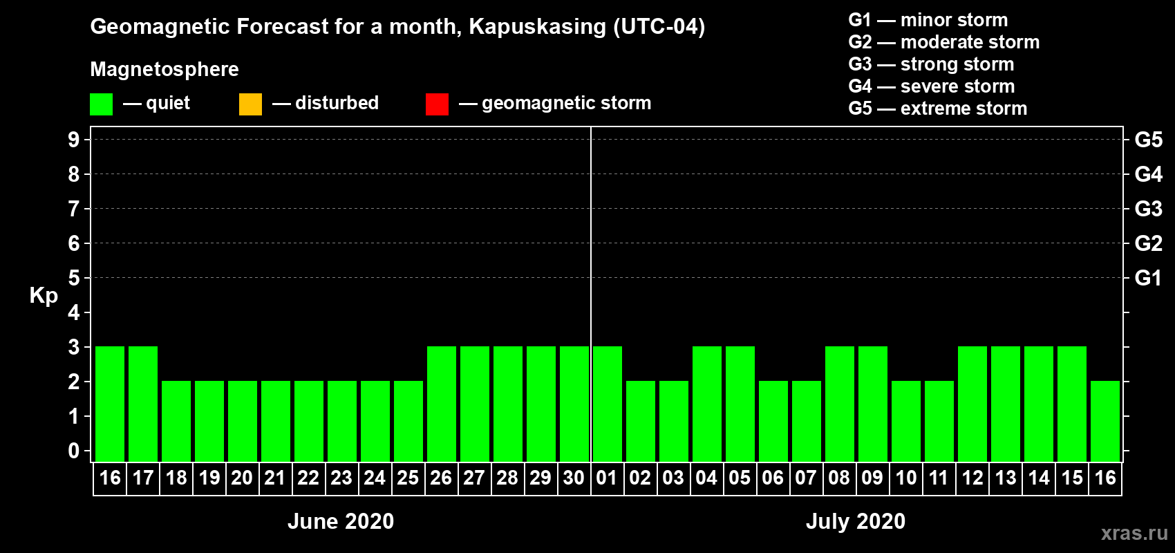 Geomagnetic storm forecast in Kapuskasing for Jun 16, 2020