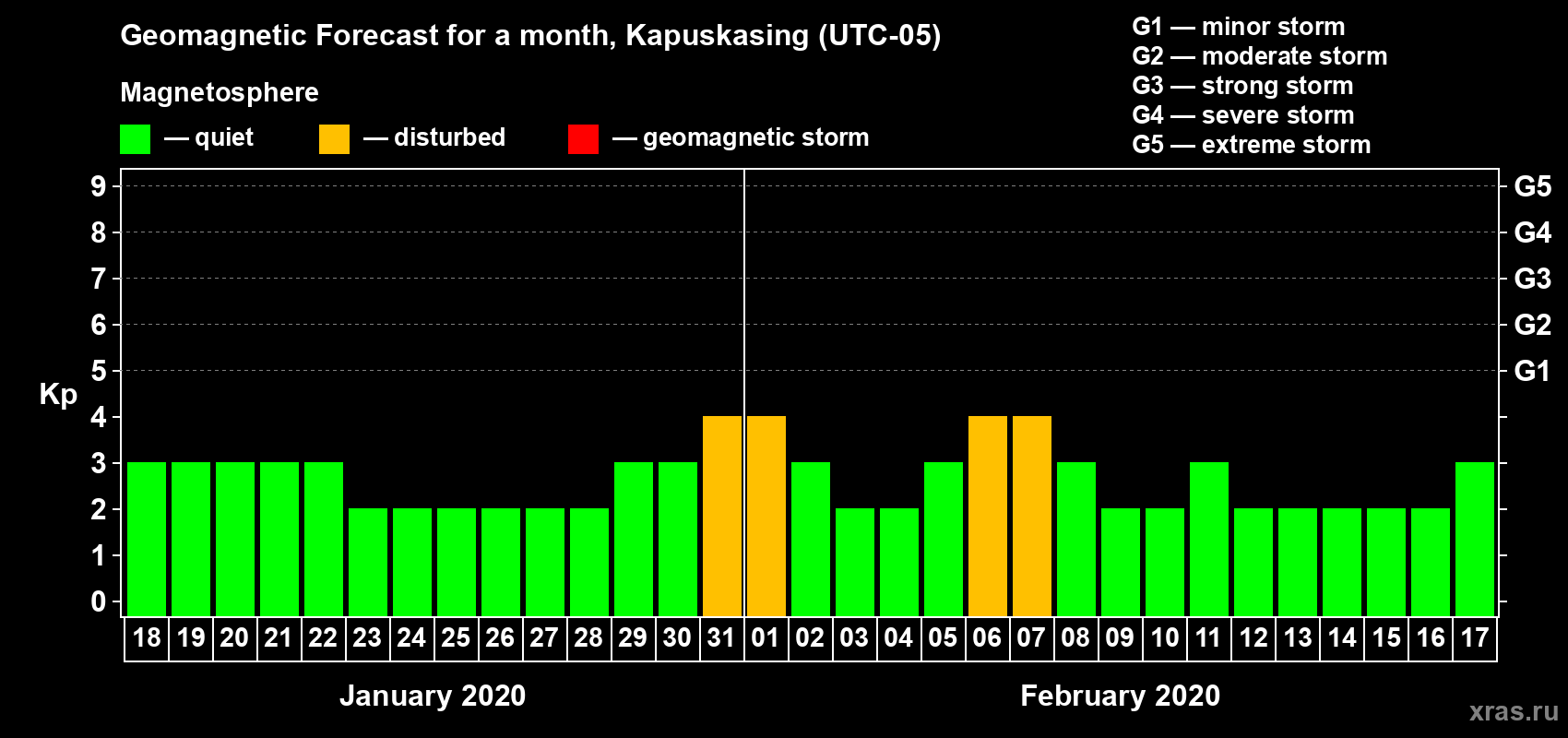 Geomagnetic storm forecast in Kapuskasing for Jan 18, 2020
