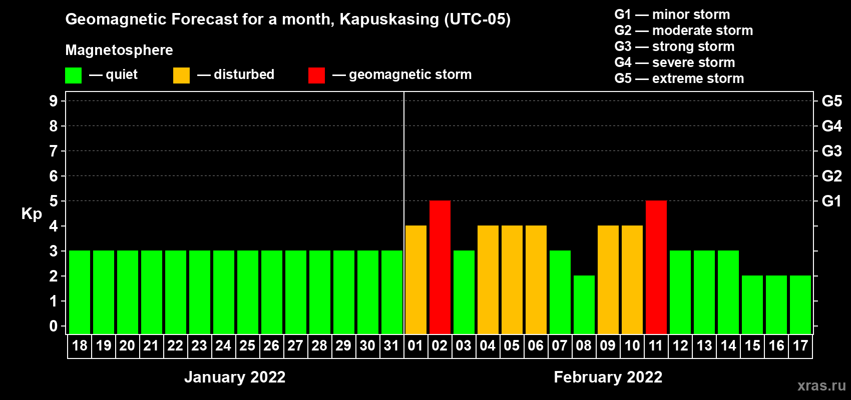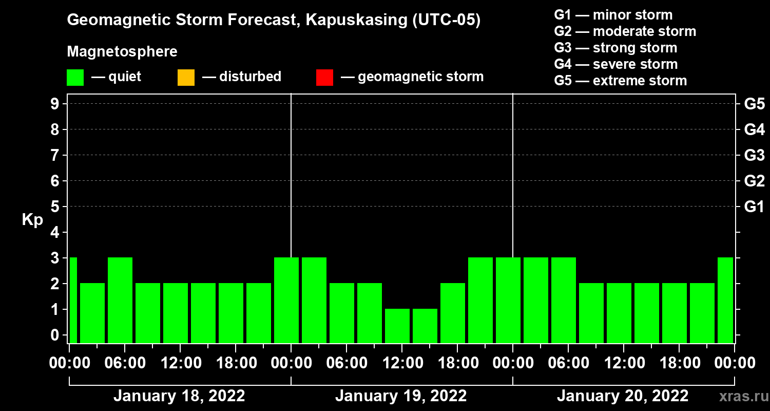 Geomagnetic storm forecast in Kapuskasing for Jan 18, 2022