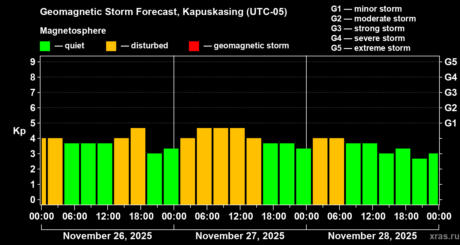 Geomagnetic storm forecast in Kapuskasing for Nov 26, 2025