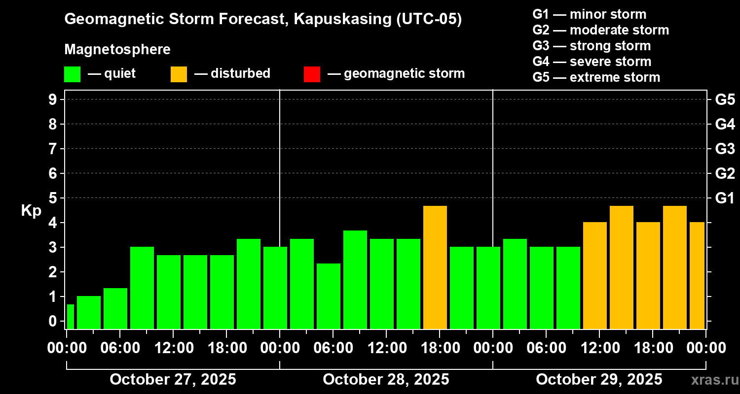 Geomagnetic storm forecast in Kapuskasing for Oct 27, 2025
