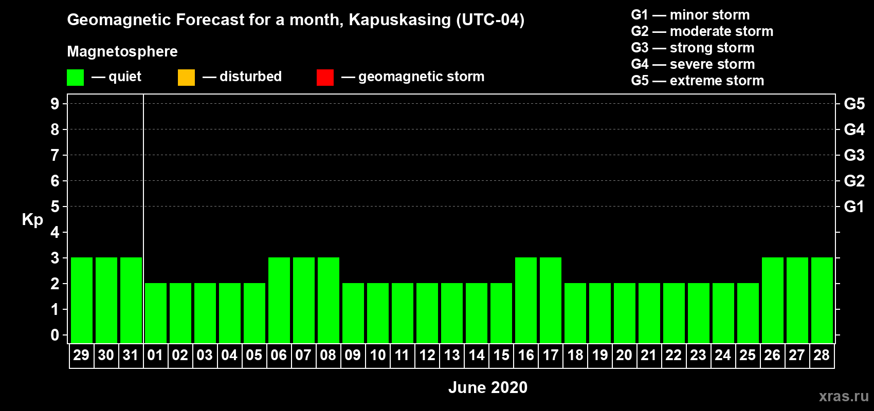 Geomagnetic storm forecast in Kapuskasing for May 29, 2020