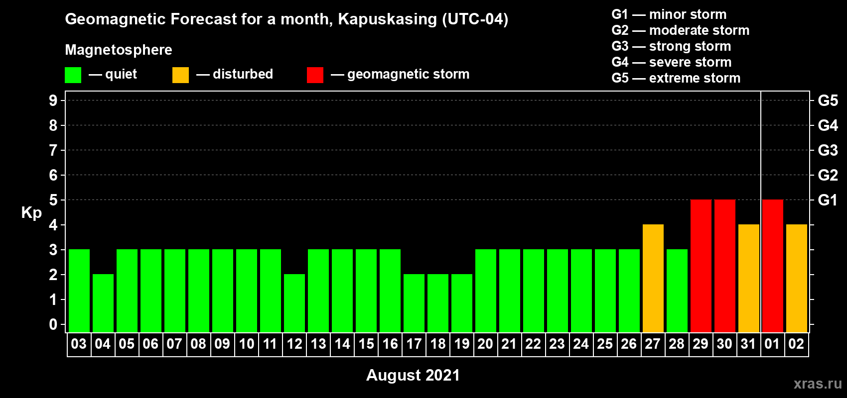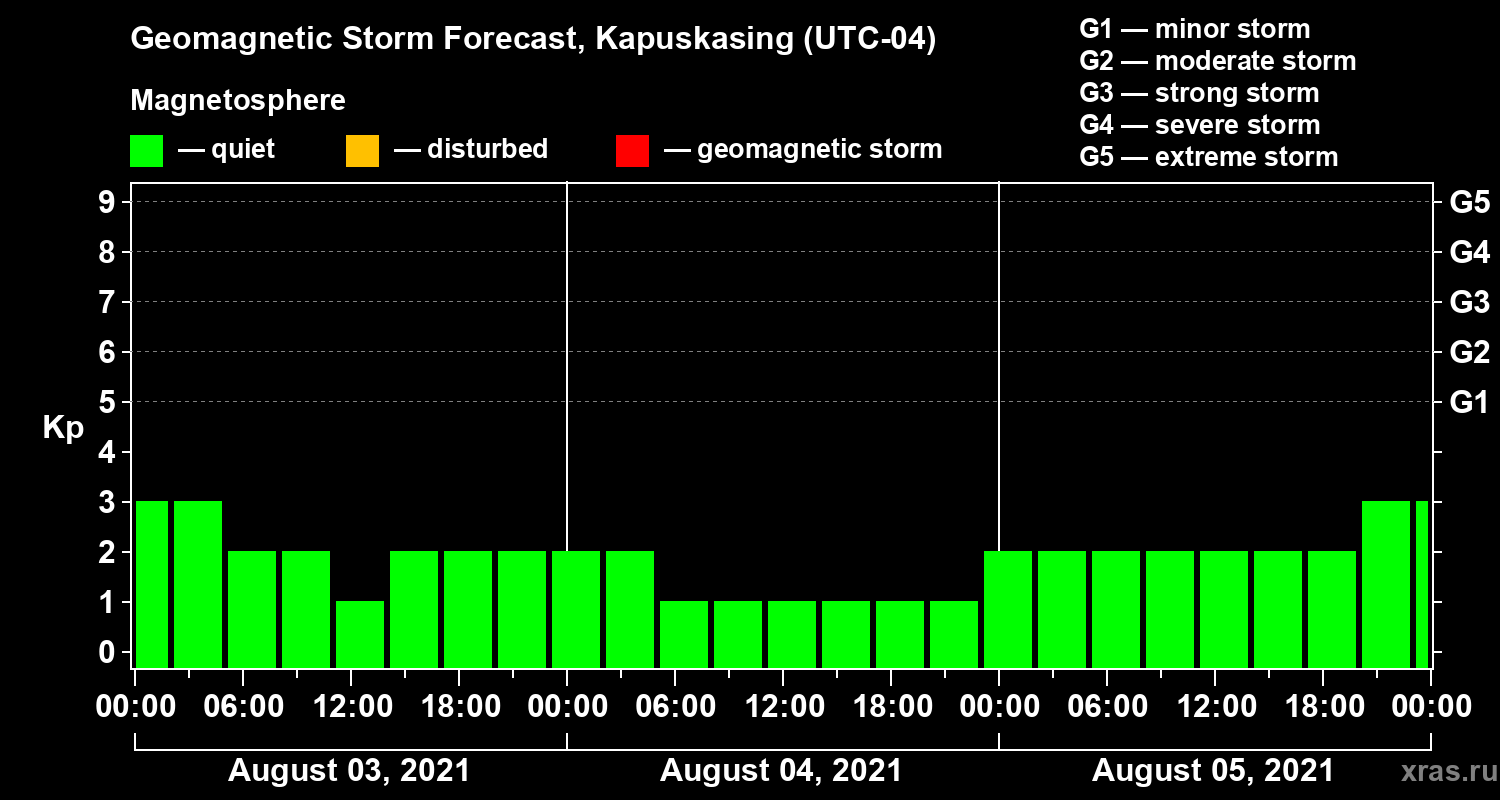 Geomagnetic storm forecast in Kapuskasing for Aug 03, 2021