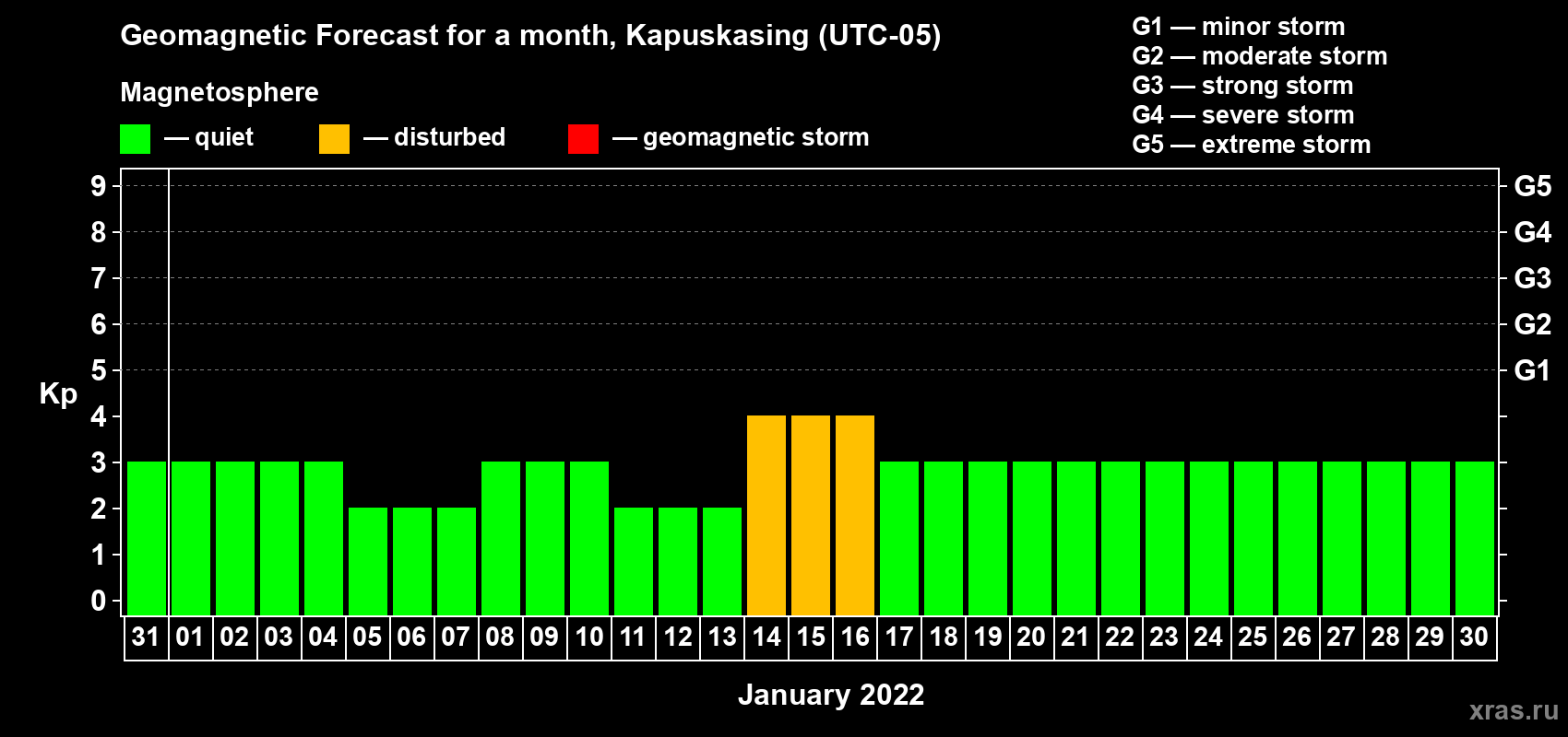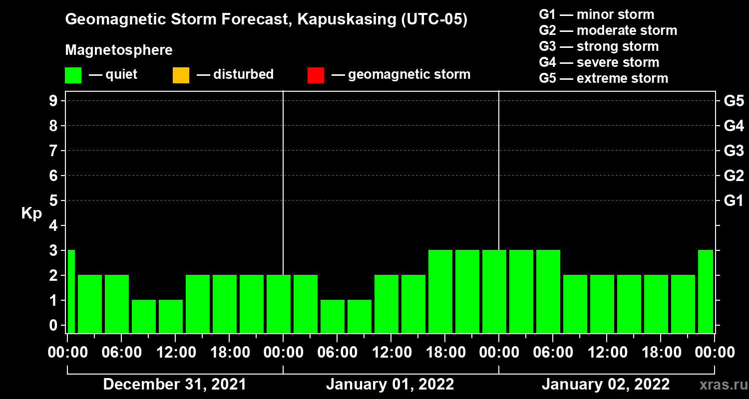 Geomagnetic storm forecast in Kapuskasing for Dec 31, 2021