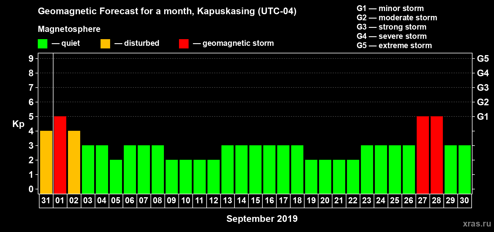 Geomagnetic storm forecast in Kapuskasing for Aug 31, 2019