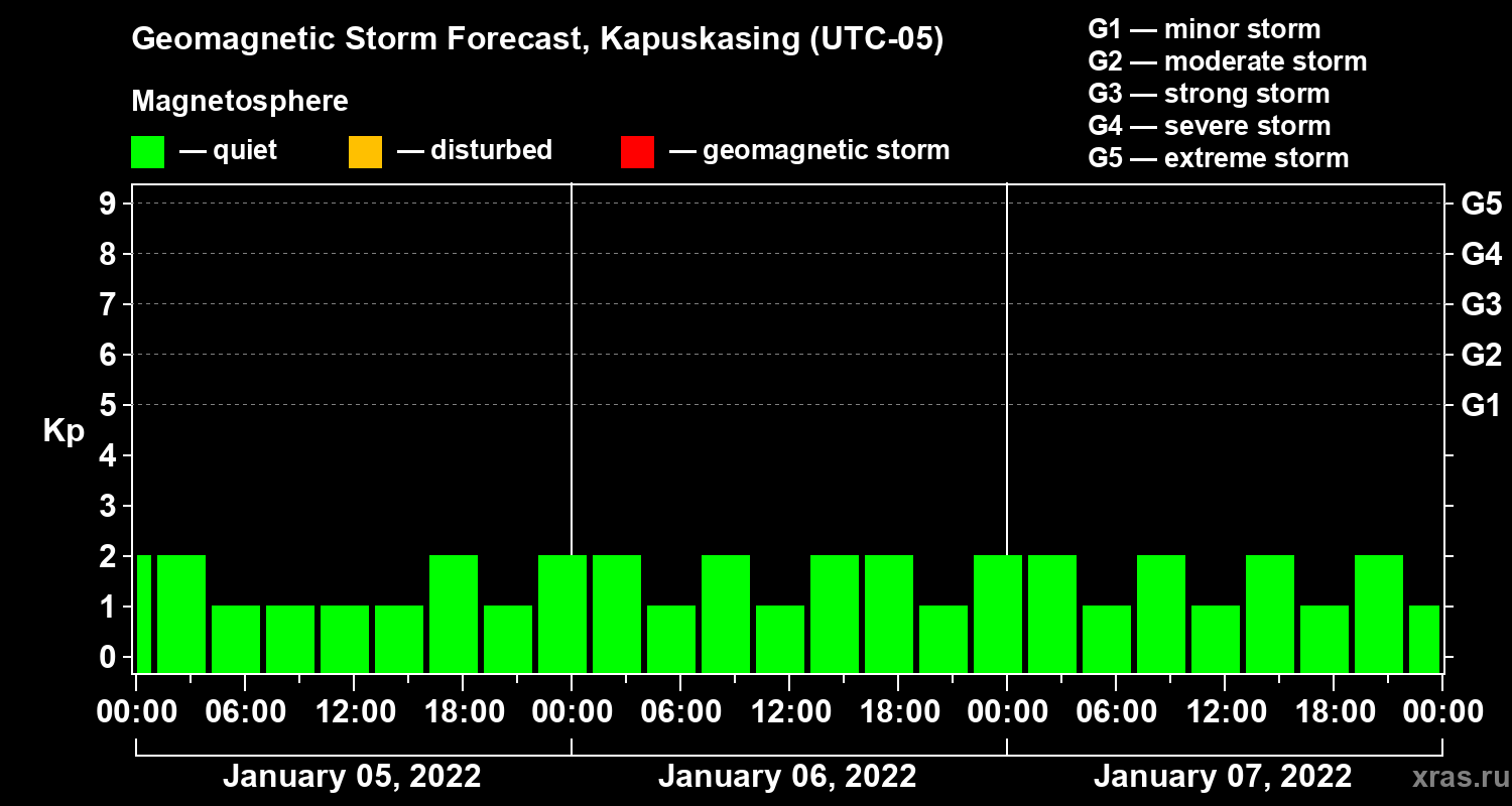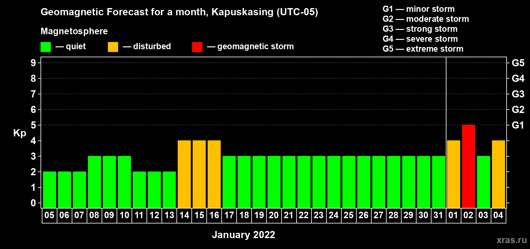 Geomagnetic storm forecast in Kapuskasing for Jan 05, 2022