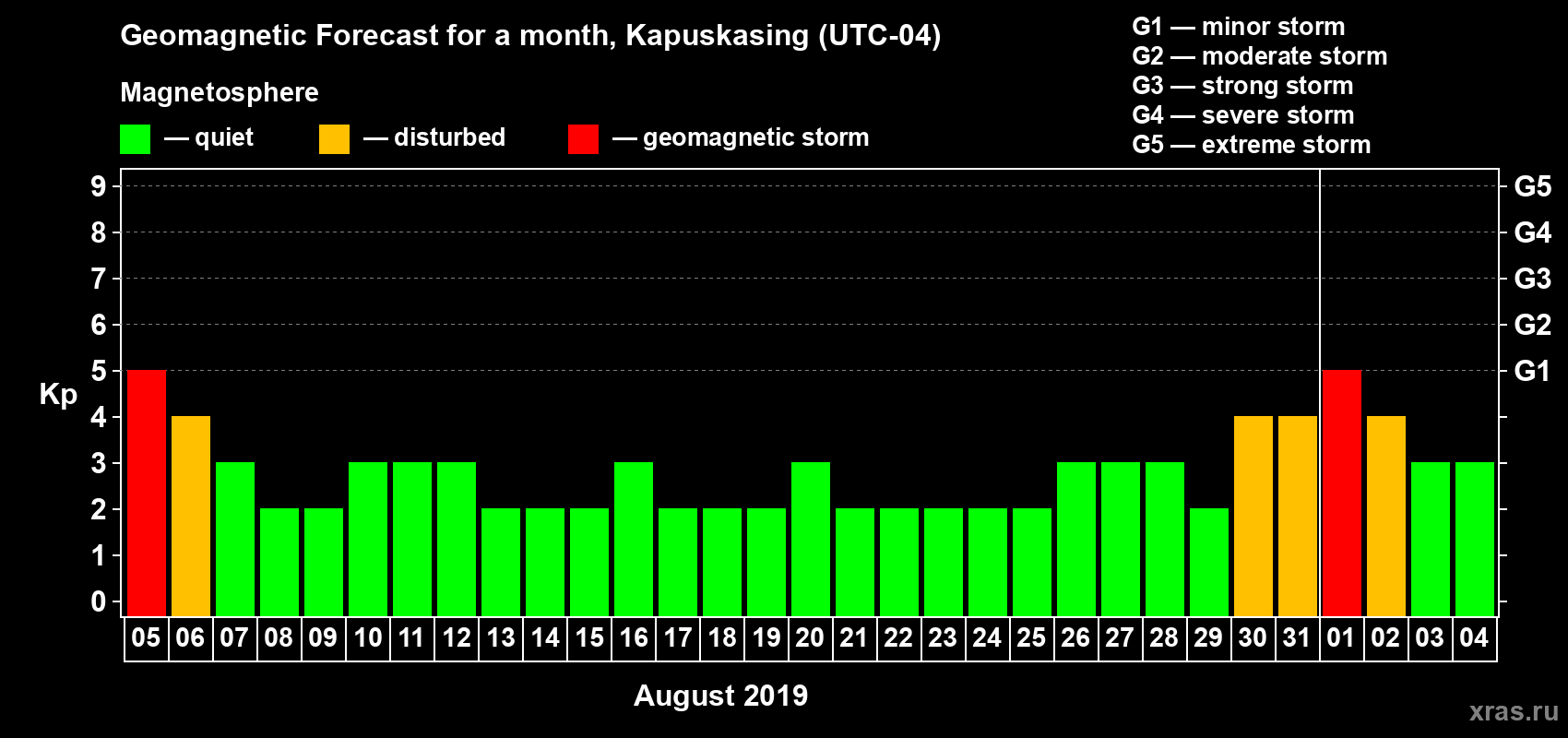 Geomagnetic storm forecast in Kapuskasing for Aug 05, 2019