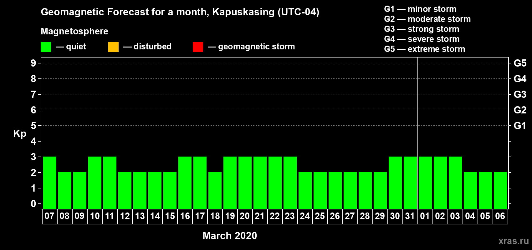 Geomagnetic storm forecast in Kapuskasing for Mar 07, 2020
