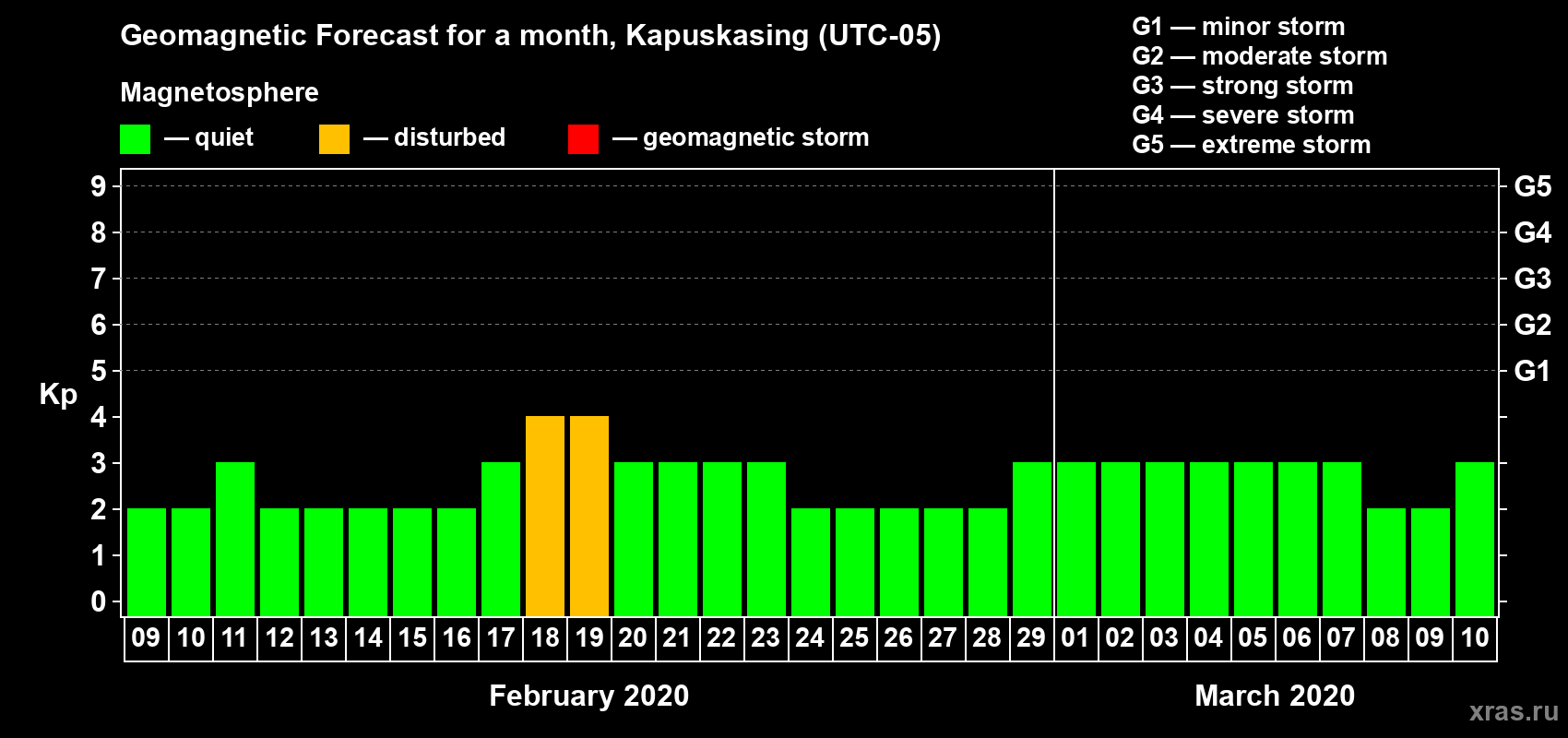 Geomagnetic storm forecast in Kapuskasing for Feb 09, 2020