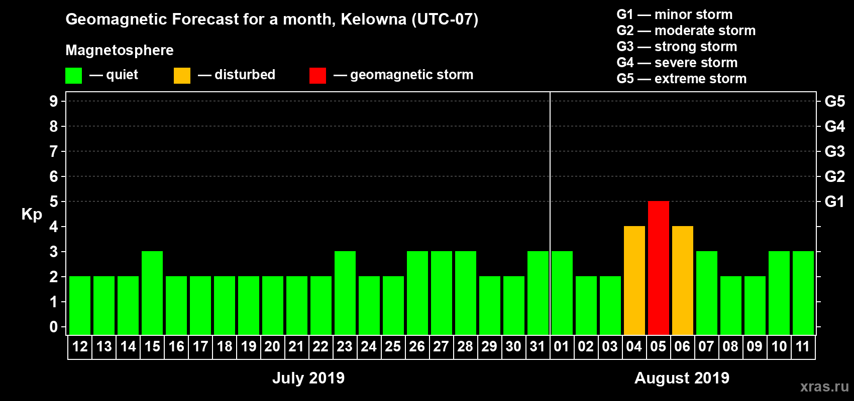 Geomagnetic storm forecast in Kelowna for Jul 12, 2019