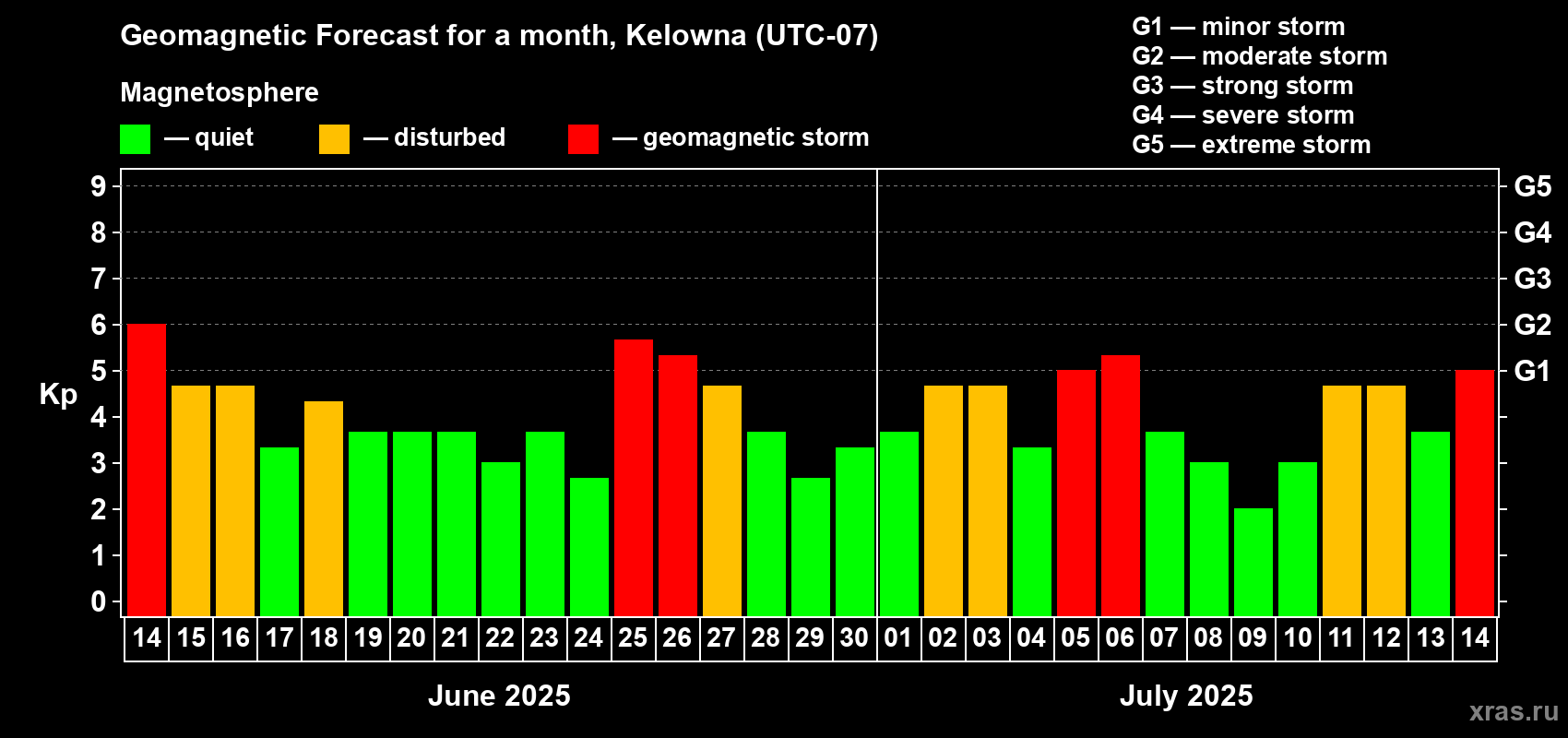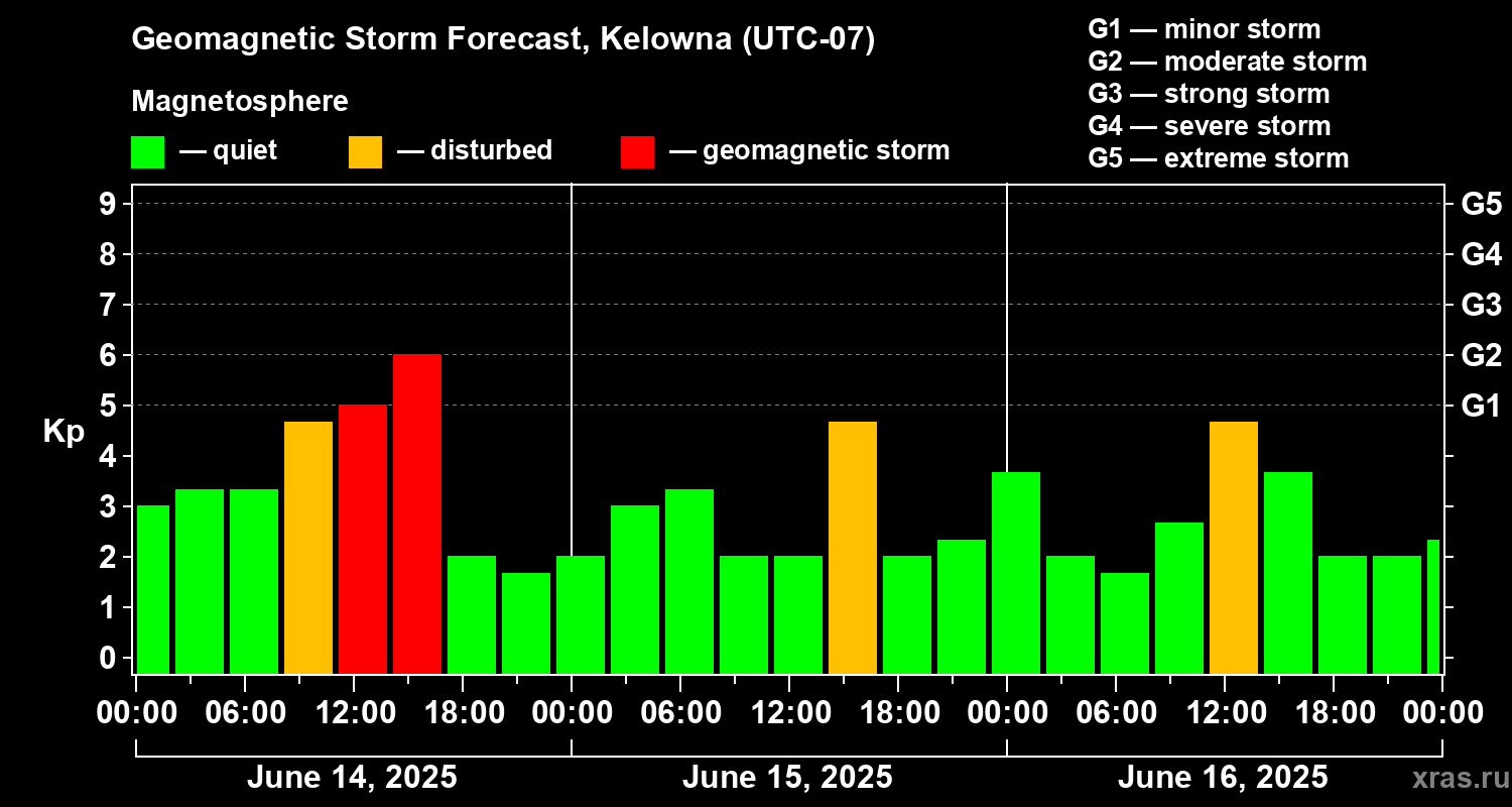 Geomagnetic storm forecast in Kelowna for Jun 14, 2025