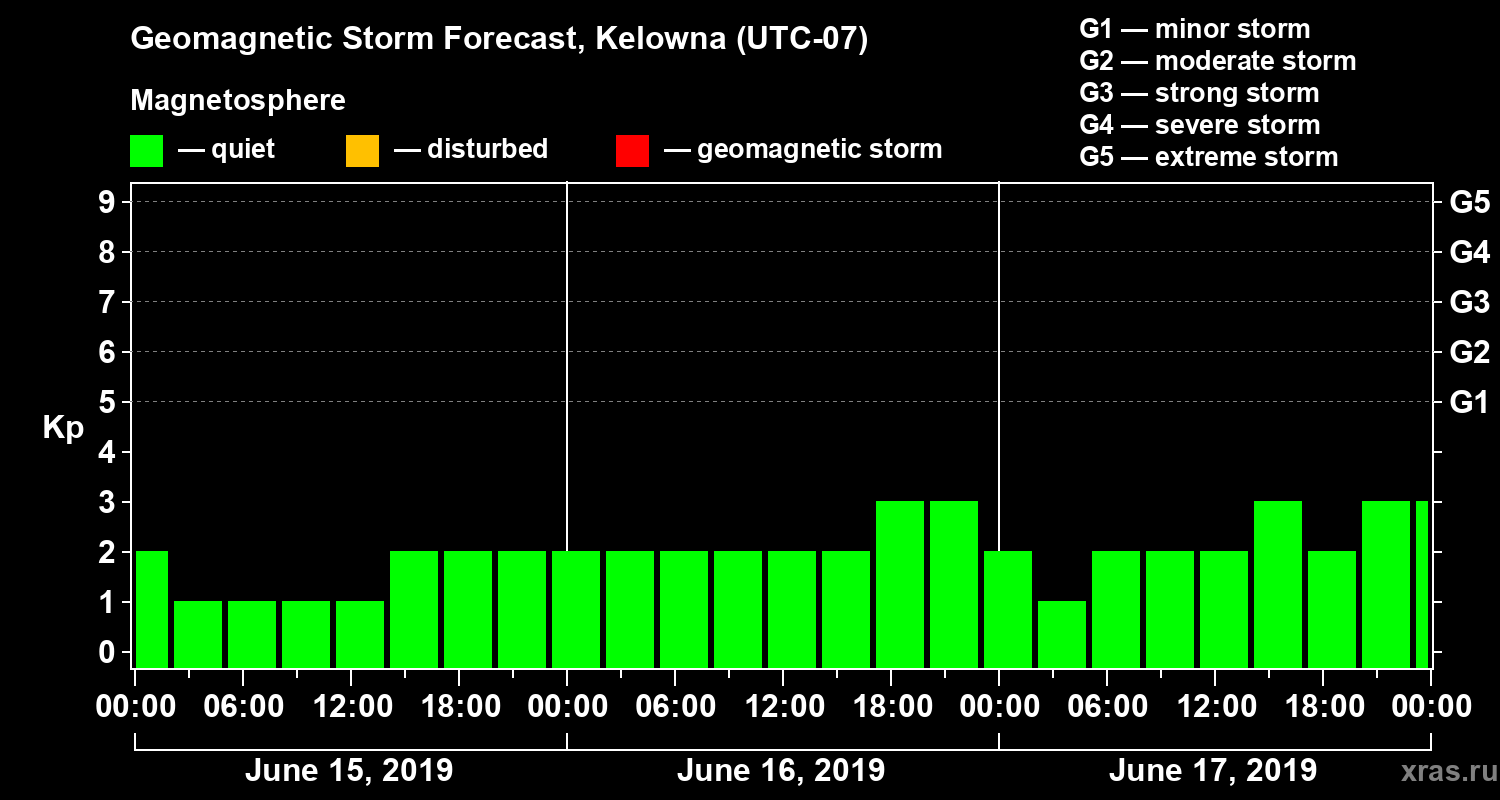 Geomagnetic storm forecast in Kelowna for Jun 15, 2019