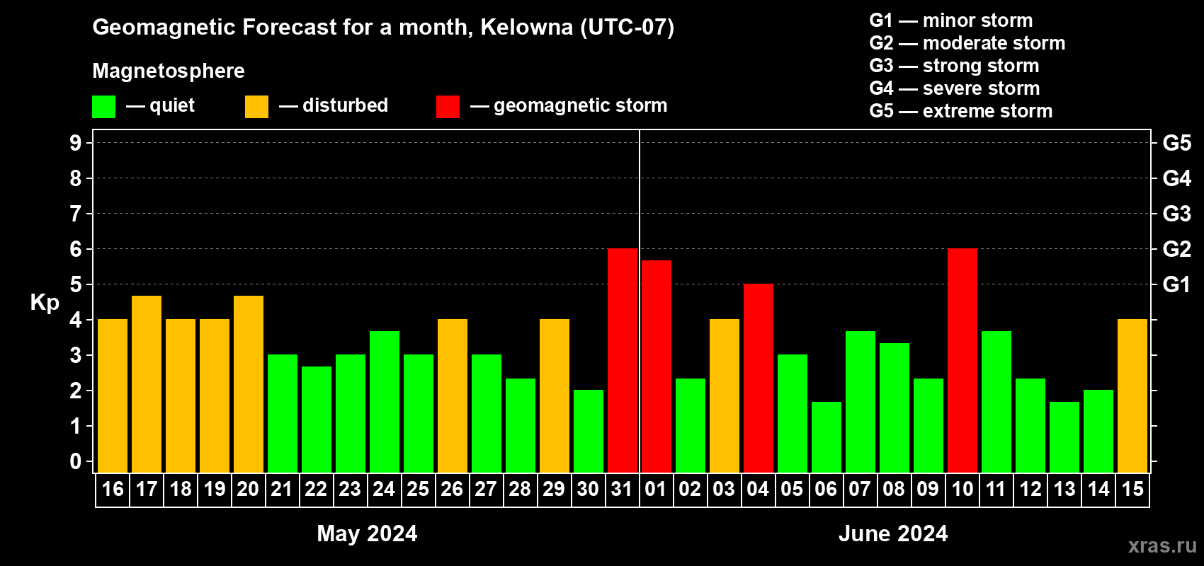 Geomagnetic storm forecast in Kelowna for May 16, 2024