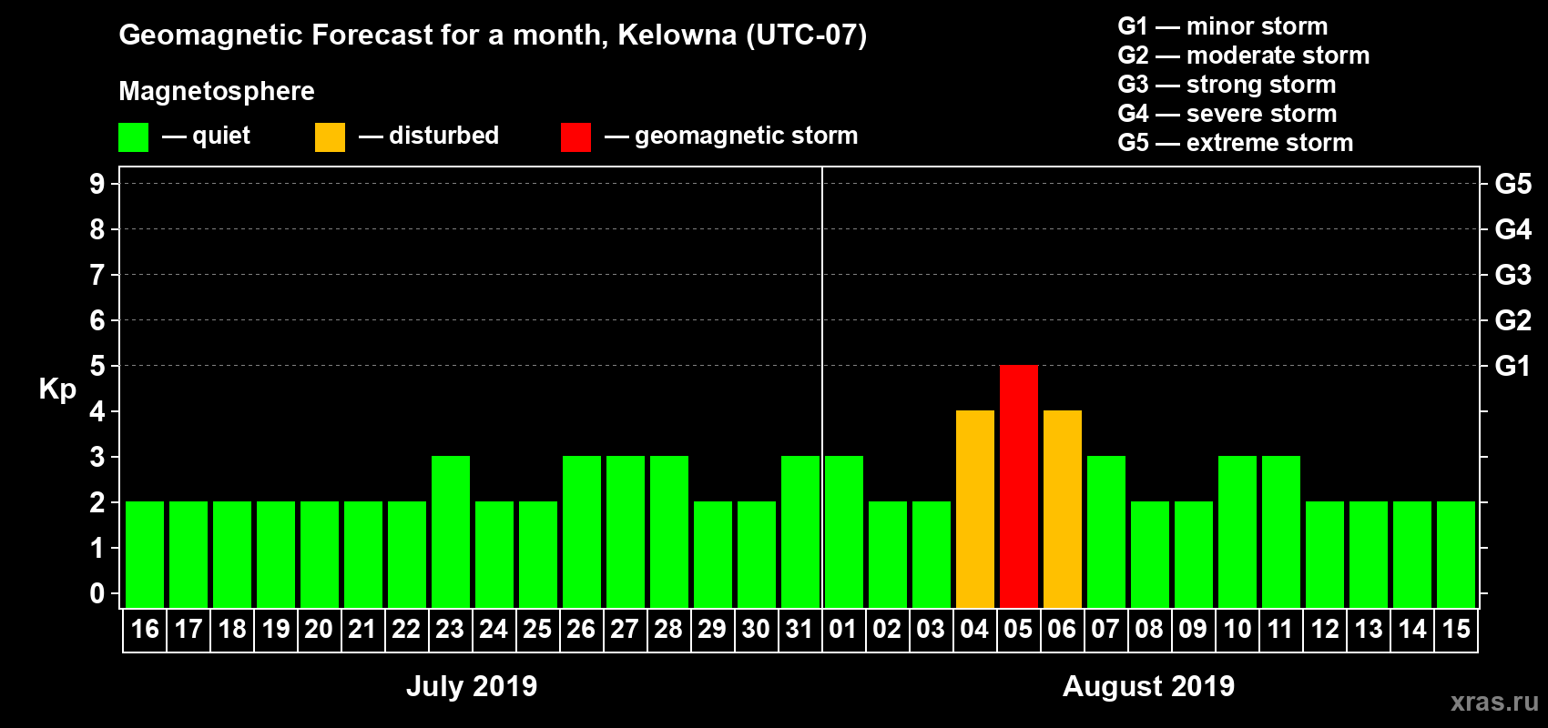 Geomagnetic storm forecast in Kelowna for Jul 16, 2019