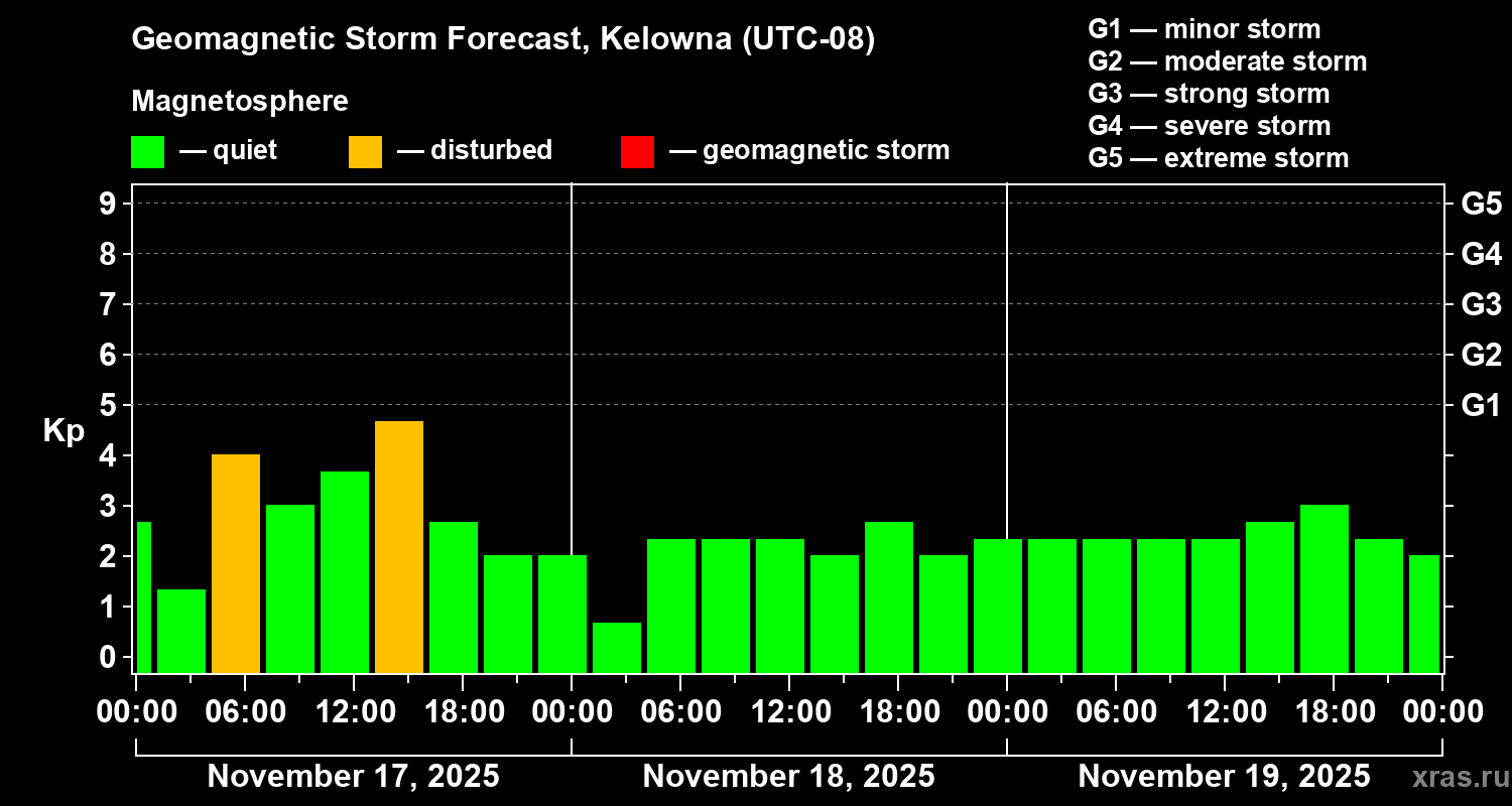 Geomagnetic storm forecast in Kelowna for Nov 17, 2025