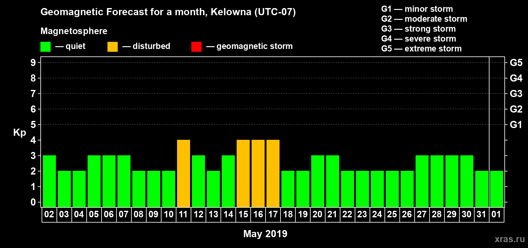 Geomagnetic storm forecast in Kelowna for May 02, 2019