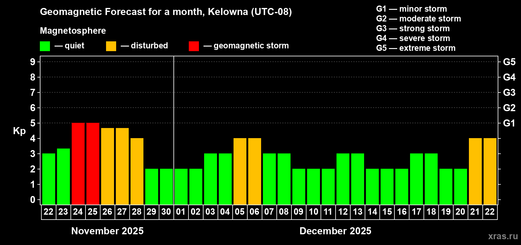 Geomagnetic storm forecast in Kelowna for Nov 22, 2025