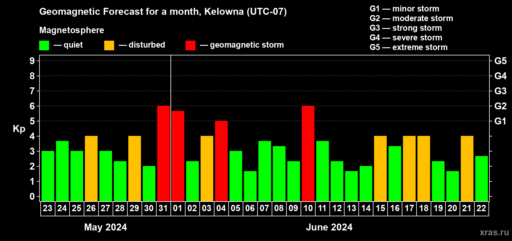 Geomagnetic storm forecast in Kelowna for May 23, 2024
