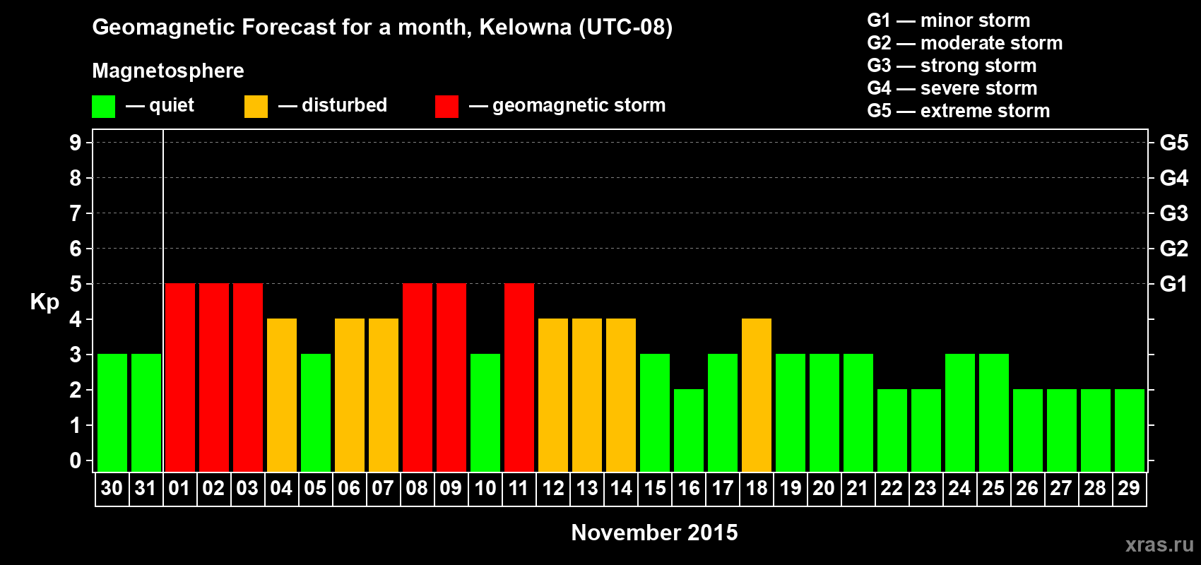 Geomagnetic storm forecast in Kelowna for Oct 30, 2015