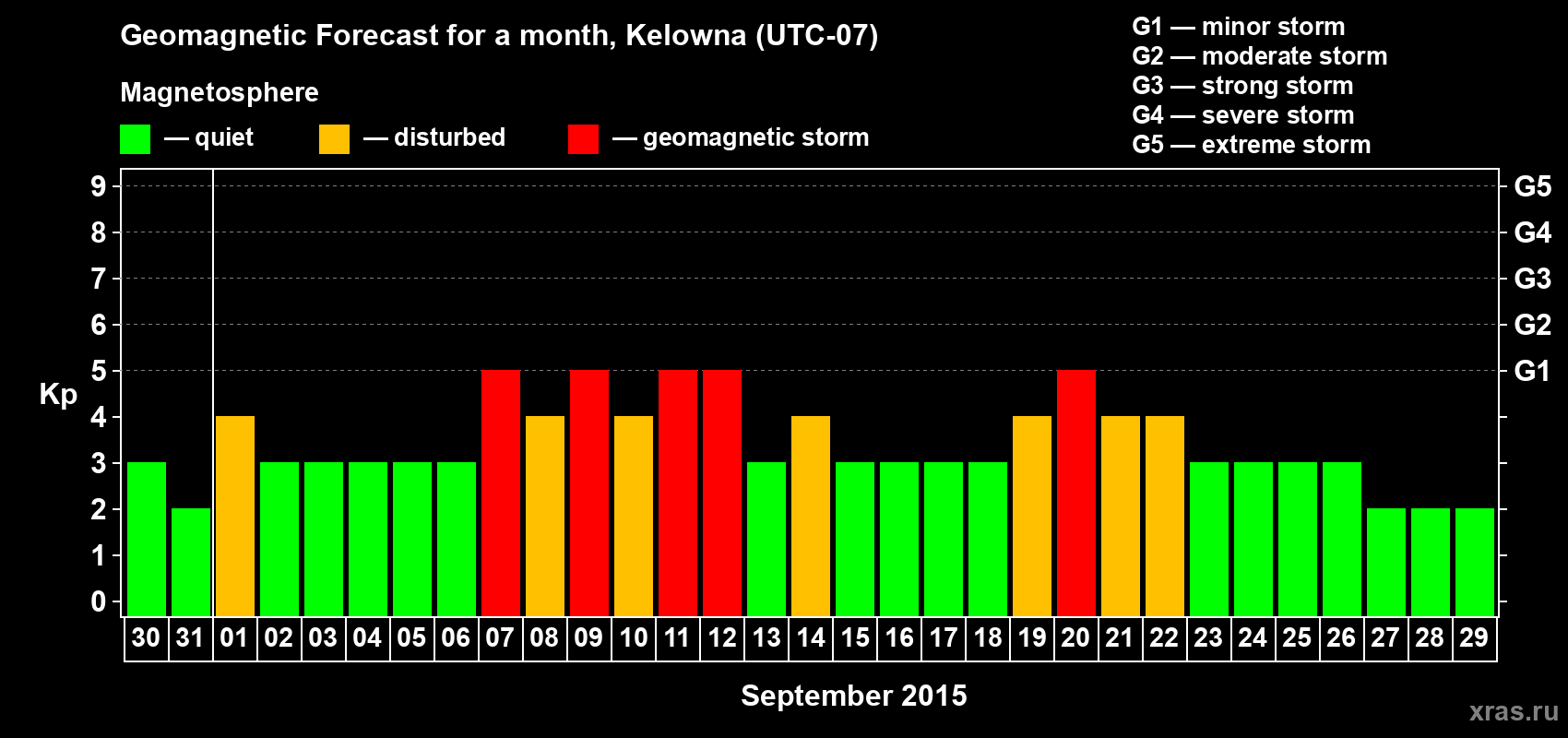 Geomagnetic storm forecast in Kelowna for Aug 30, 2015