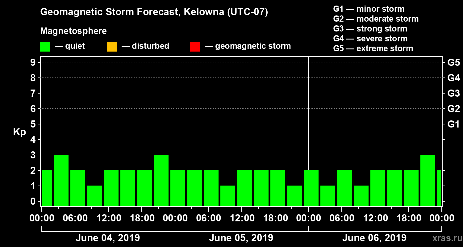 Geomagnetic storm forecast in Kelowna for Jun 04, 2019