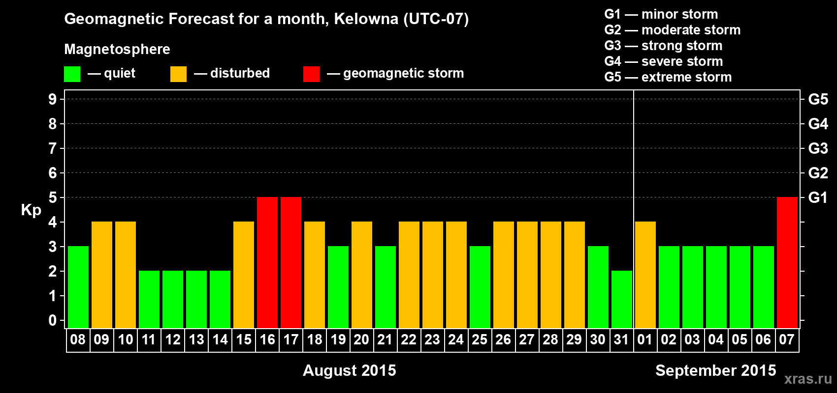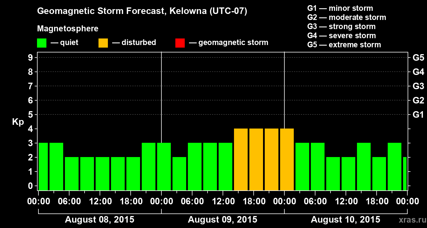 Geomagnetic storm forecast in Kelowna for Aug 08, 2015