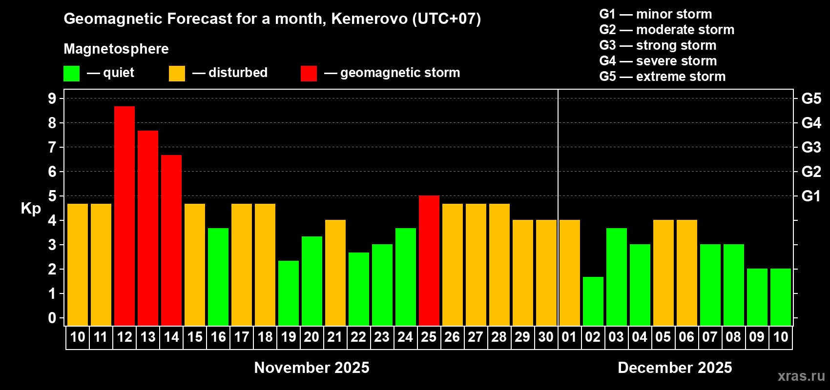 Geomagnetic storm forecast in Kemerovo for Nov 10, 2025