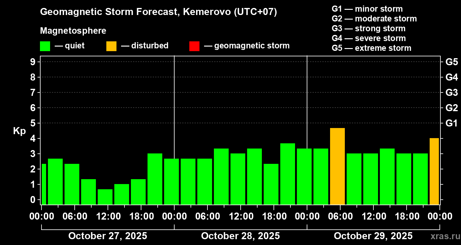Geomagnetic storm forecast in Kemerovo for Oct 27, 2025