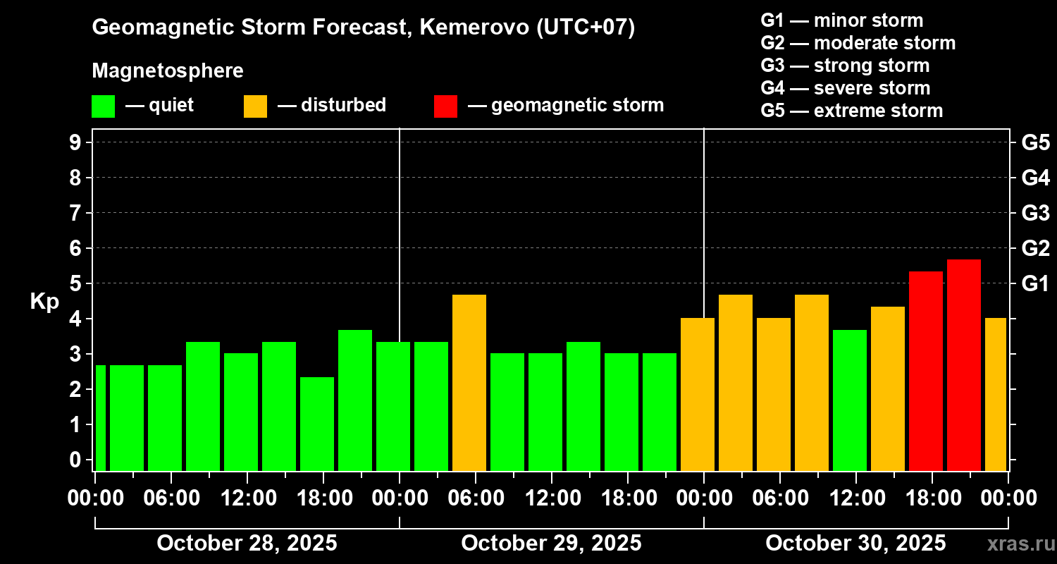 Geomagnetic storm forecast in Kemerovo for Oct 28, 2025