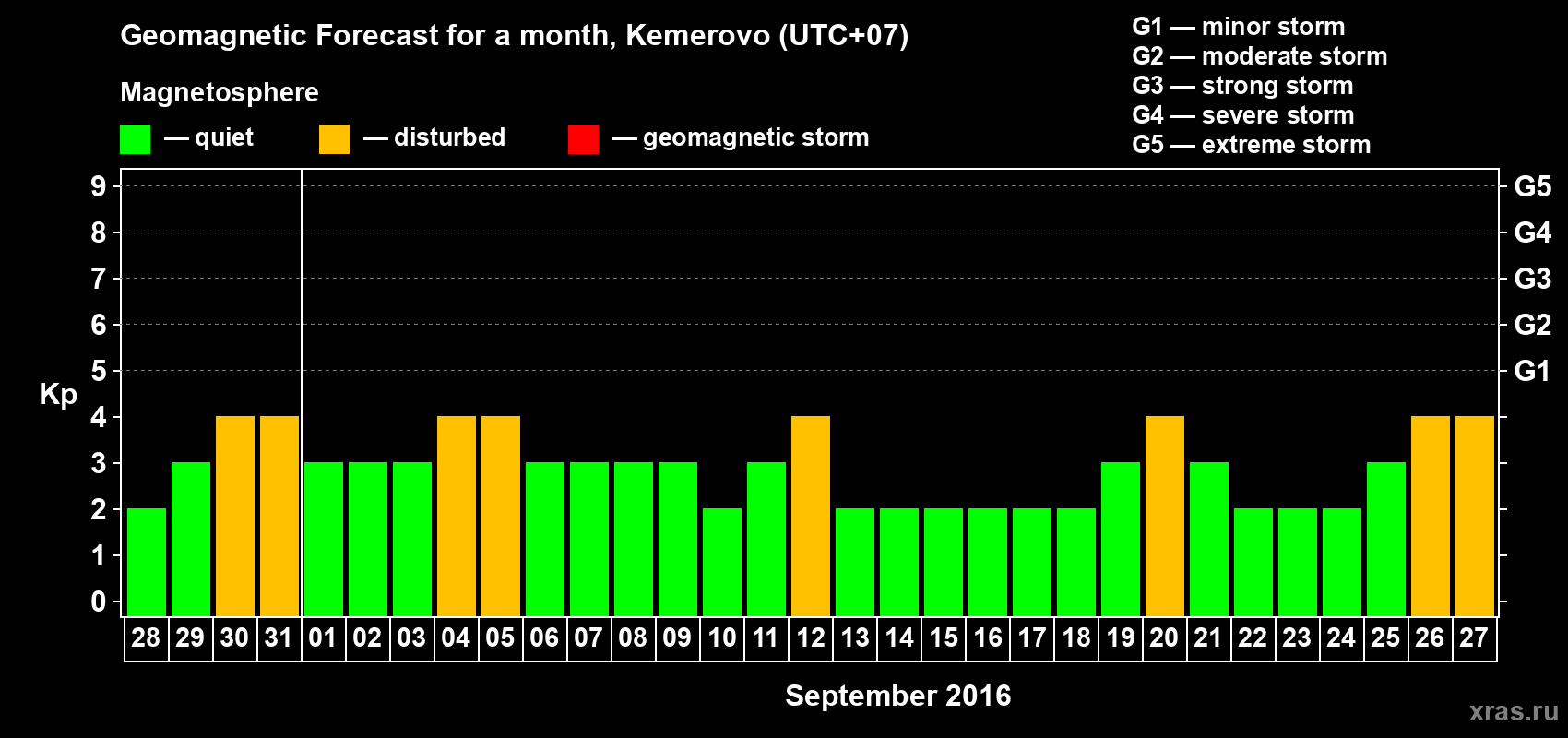 Geomagnetic storm forecast in Kemerovo for Aug 28, 2016