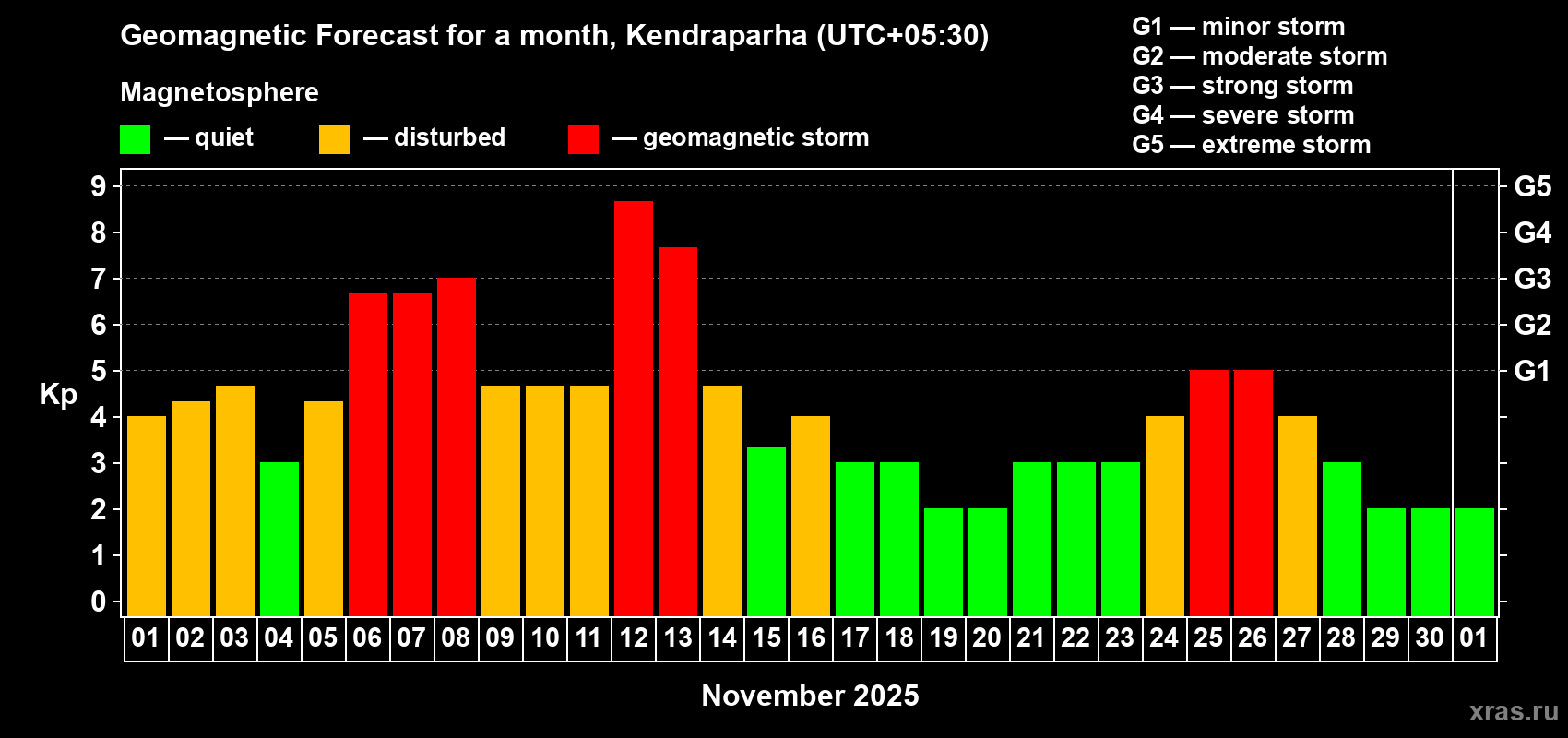 Geomagnetic storm forecast in Kendraparha for Nov 01, 2025