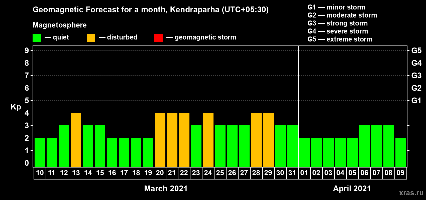 Geomagnetic storm forecast in Kendraparha for Mar 10, 2021