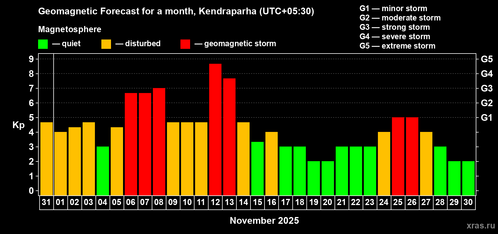 Geomagnetic storm forecast in Kendraparha for Oct 31, 2025