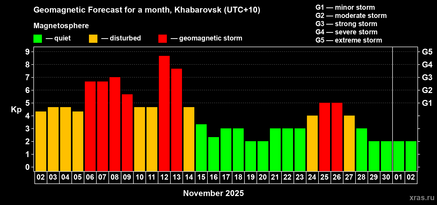 Geomagnetic storm forecast in Khabarovsk for Nov 02, 2025