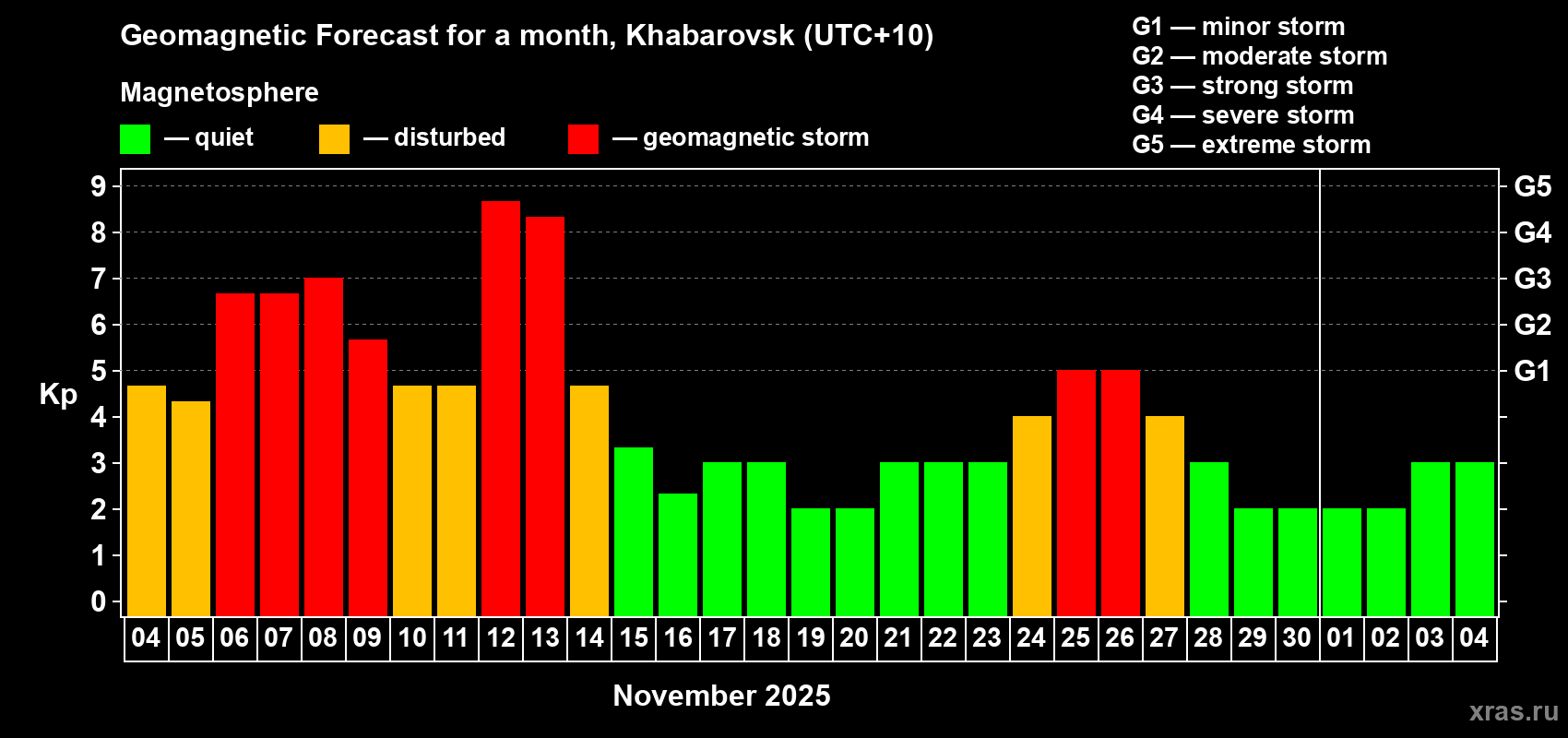 Geomagnetic storm forecast in Khabarovsk for Nov 04, 2025