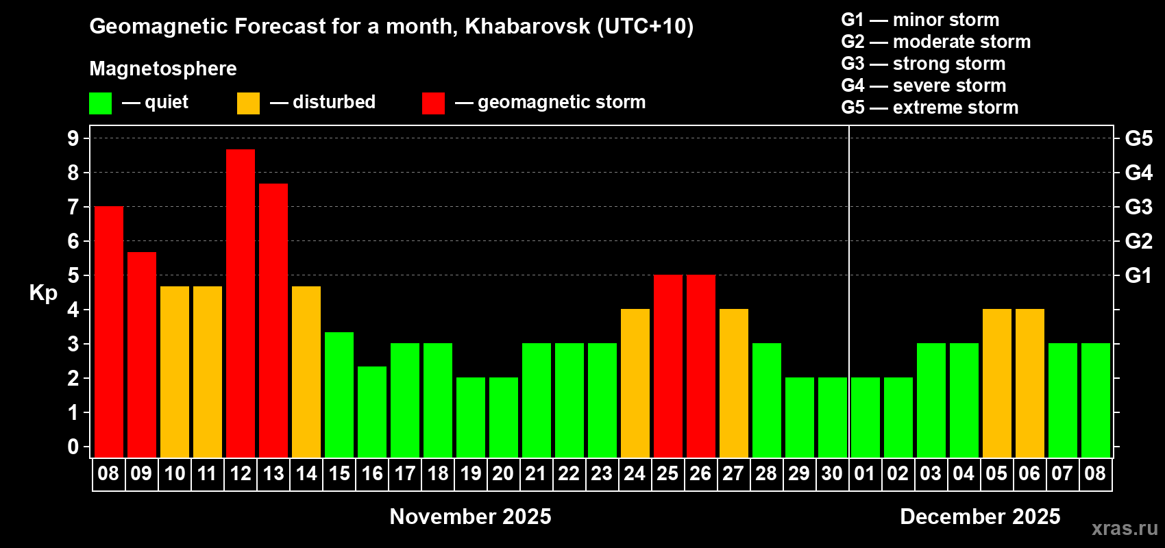 Geomagnetic storm forecast in Khabarovsk for Nov 08, 2025