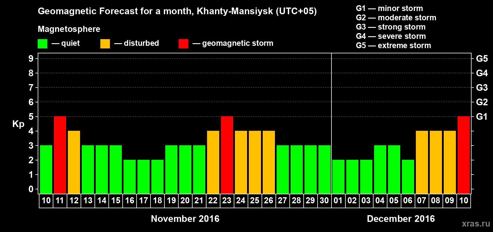 Geomagnetic storm forecast in Khanty-Mansiysk for Nov 10, 2016