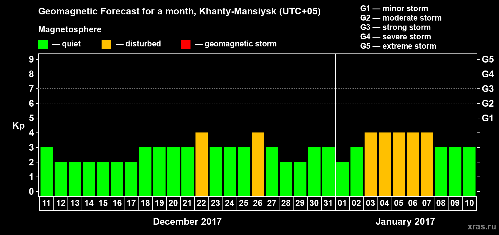 Geomagnetic storm forecast in Khanty-Mansiysk for Dec 11, 2016