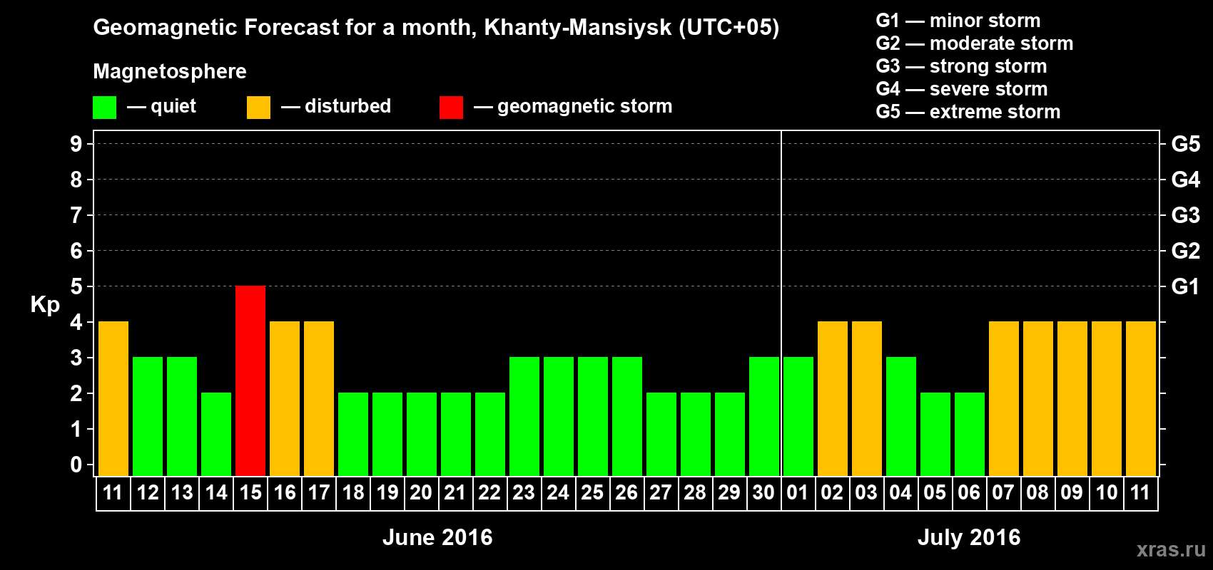 Geomagnetic storm forecast in Khanty-Mansiysk for Jun 11, 2016