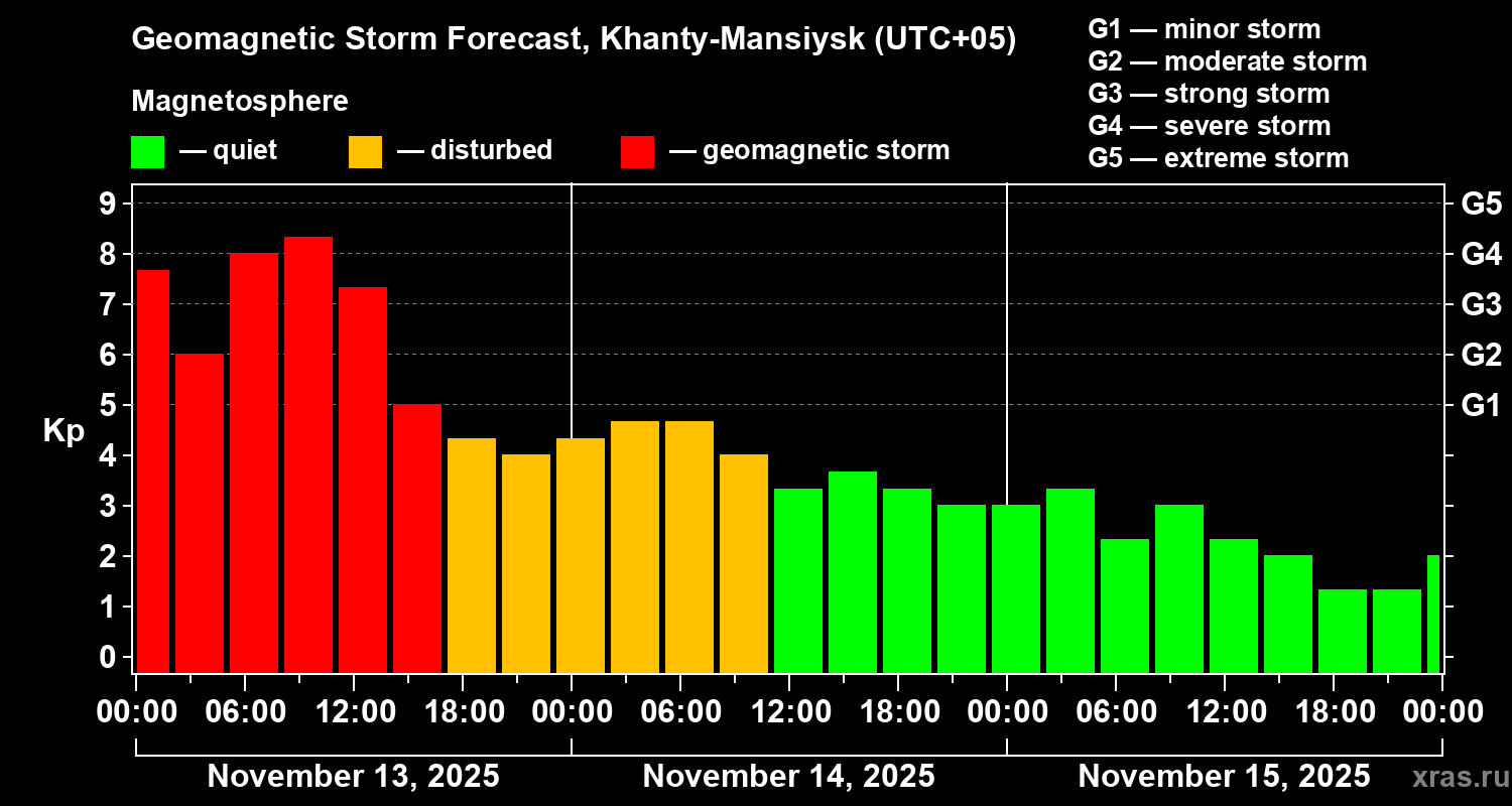 Geomagnetic storm forecast in Khanty-Mansiysk for Nov 13, 2025