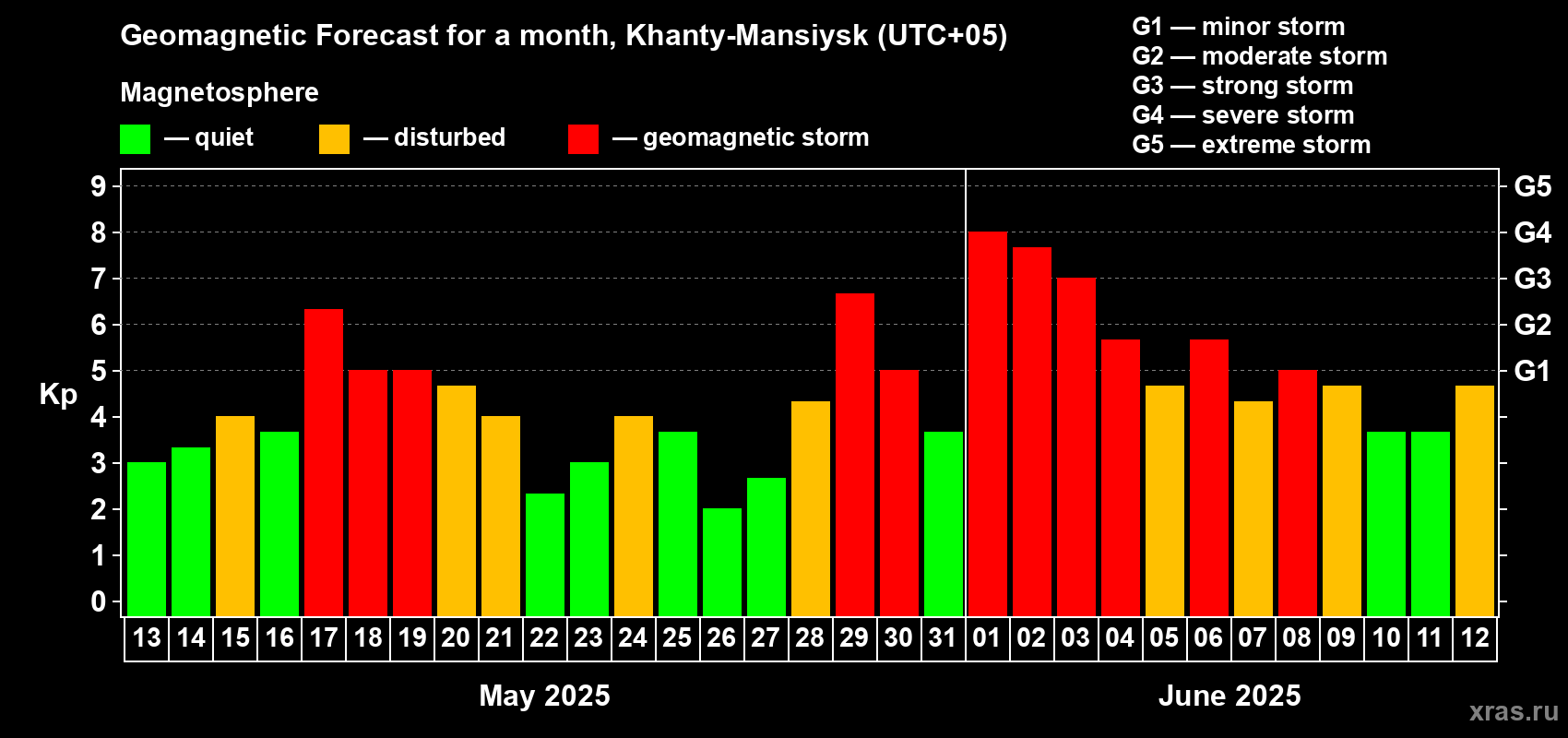 Geomagnetic storm forecast in Khanty-Mansiysk for May 13, 2025