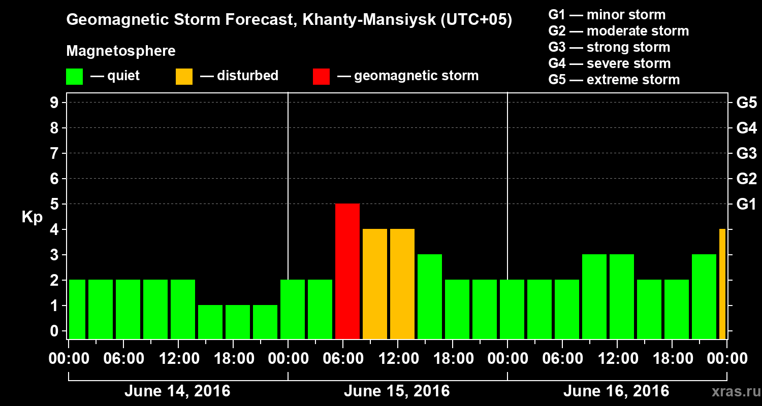 Geomagnetic storm forecast in Khanty-Mansiysk for Jun 14, 2016