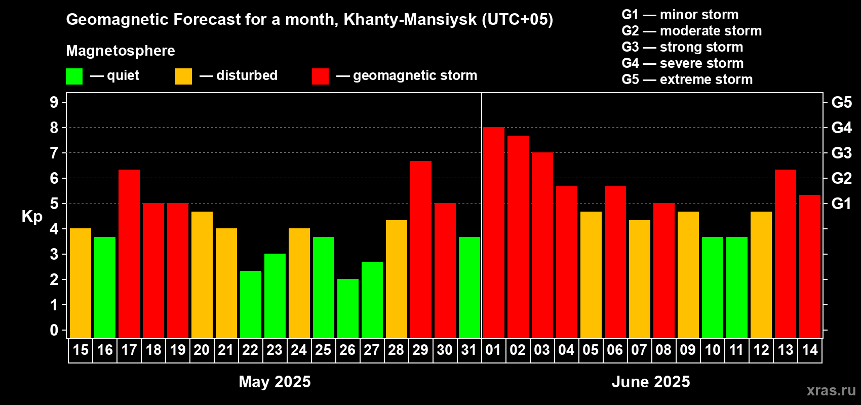 Geomagnetic storm forecast in Khanty-Mansiysk for May 15, 2025