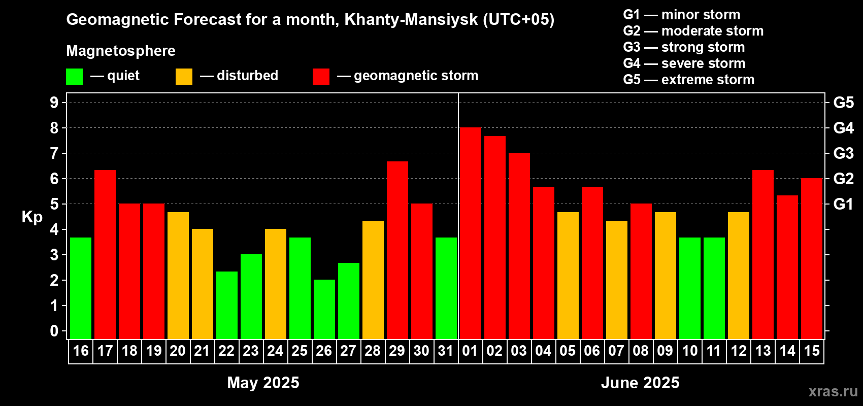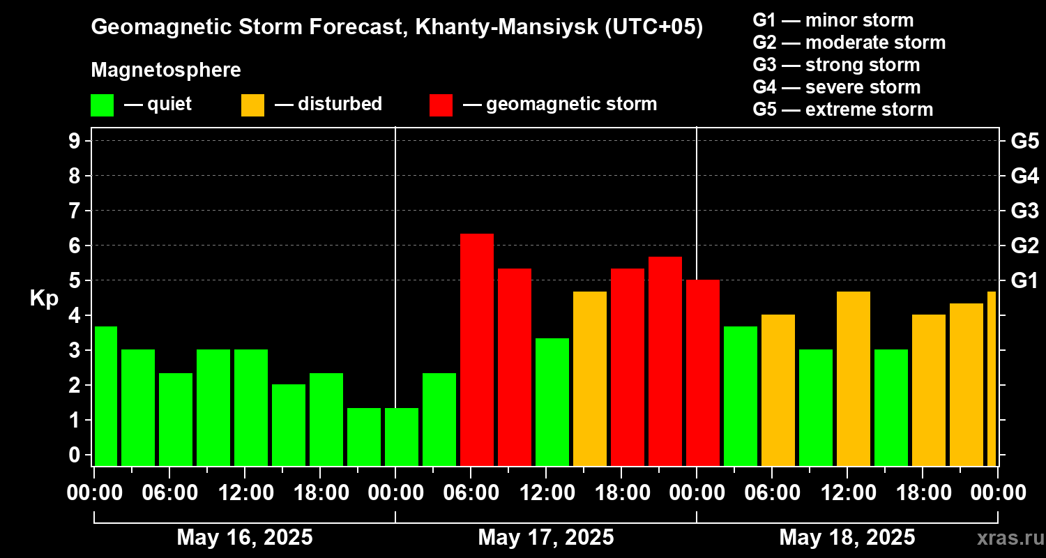 Geomagnetic storm forecast in Khanty-Mansiysk for May 16, 2025