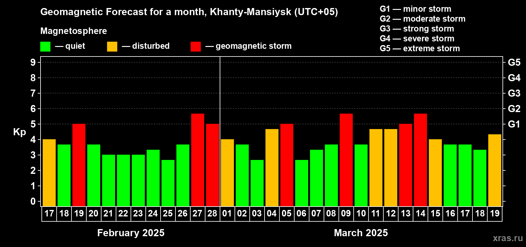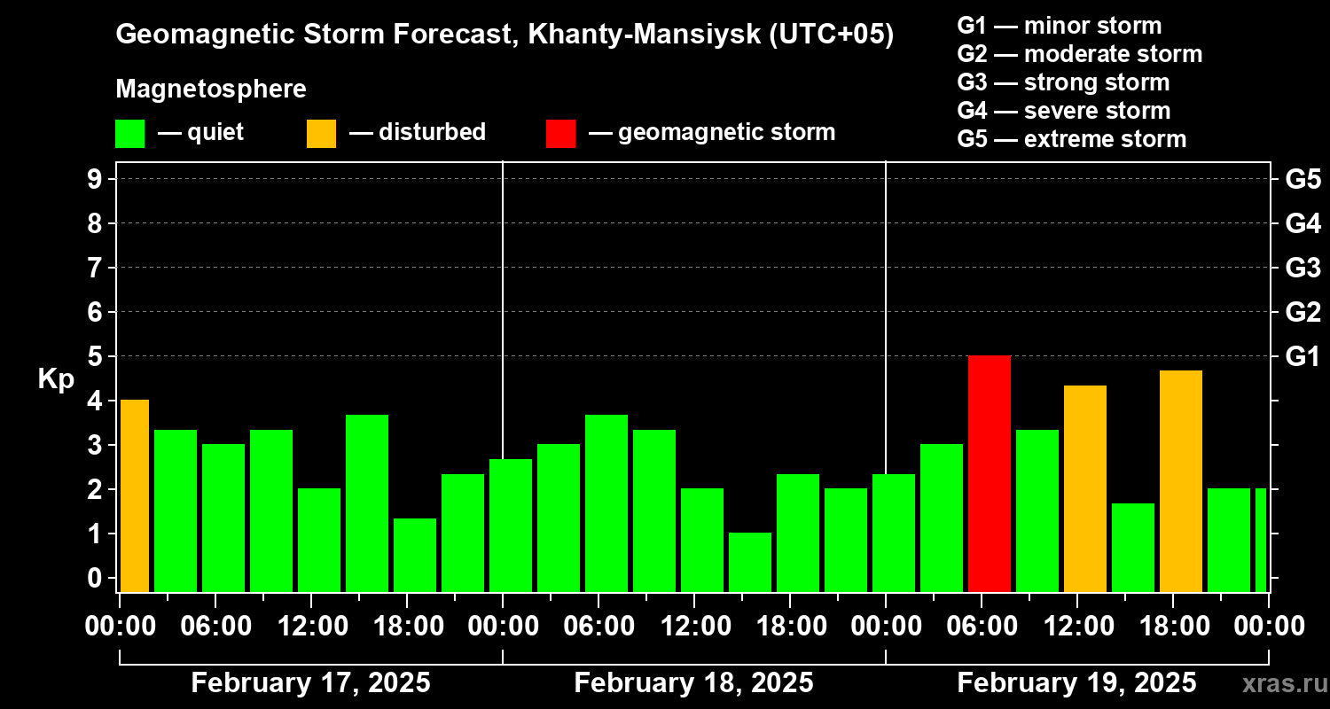 Geomagnetic activity forecast in Khanty-Mansiysk — Feb 17, 2025