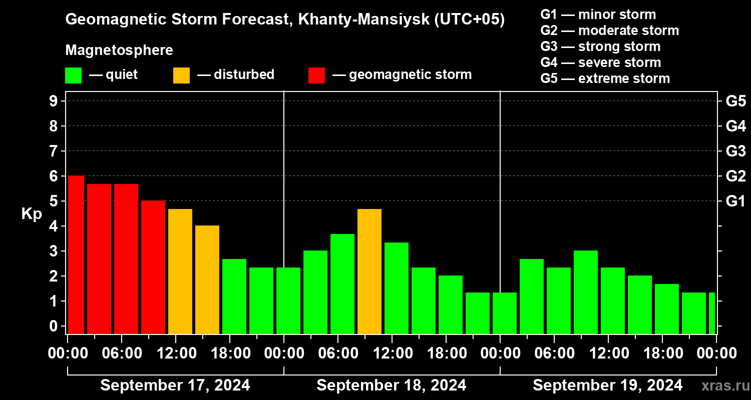 Geomagnetic storm forecast in Khanty-Mansiysk for Sep 17, 2024